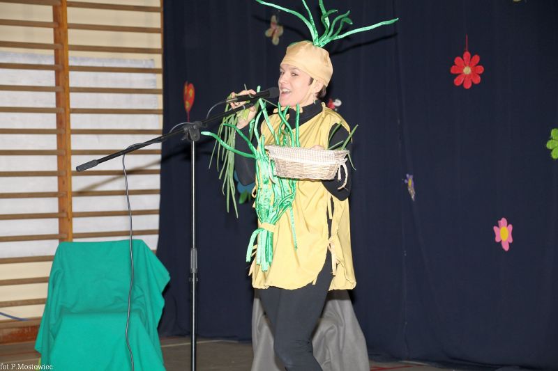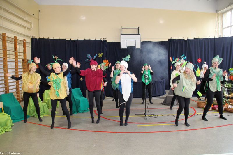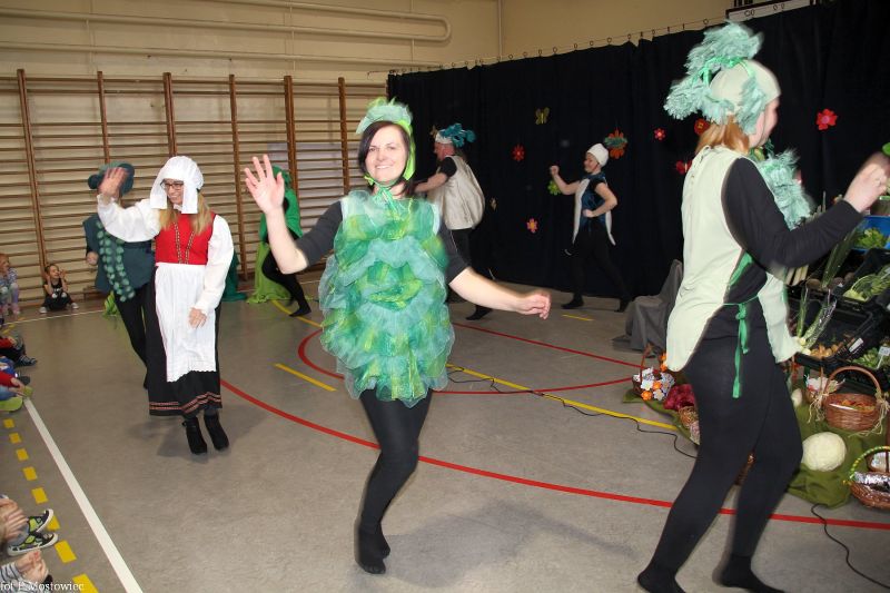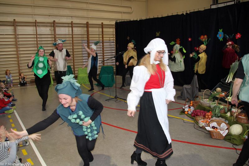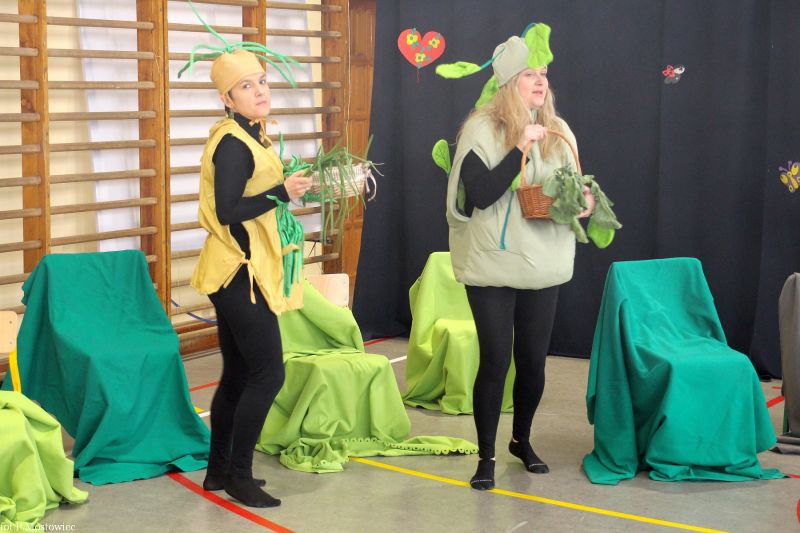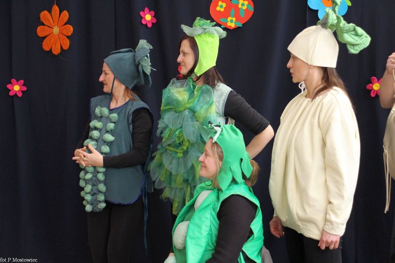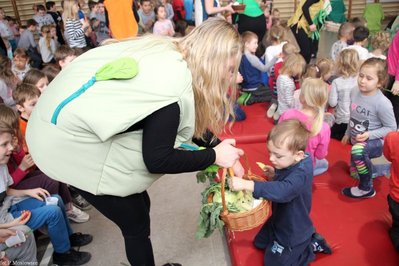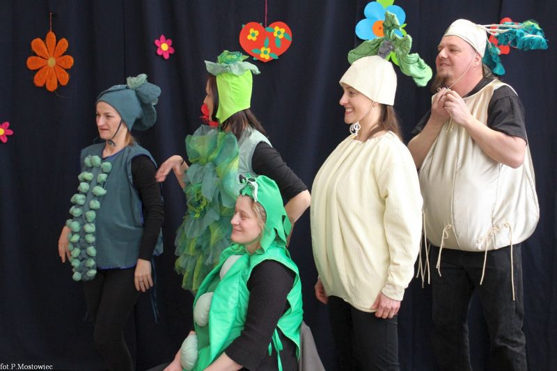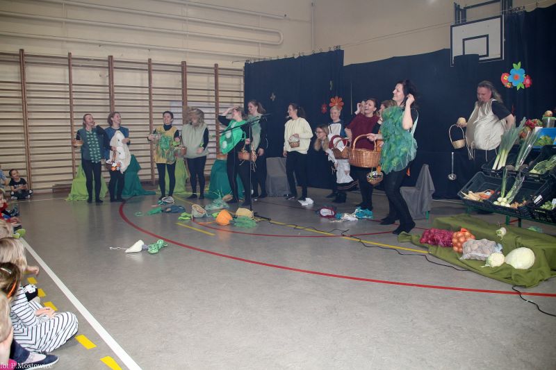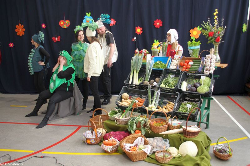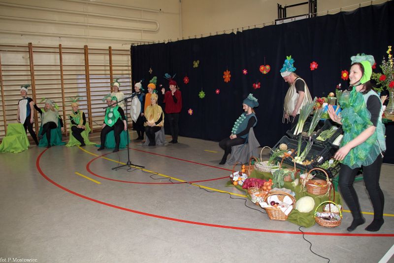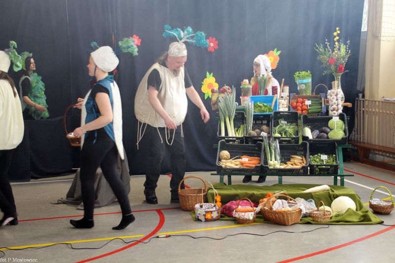 Było to bardzo barwne, pełne humoru przedstawienie na podstawie wiersza Jana Brzechwy „Na straganie”. Fascynująca scenografia, kolorowe kostiumy, wesołe postacie, humorystyczne dialogi oraz cudowny przekaz na temat wiosennych nowalijek, zdrowia i wartości odżywczych, a wszystko to przeplatane skoczną, rytmiczną muzyką wprowadziły wszystkich w radosny, wiosenny nastrój. Na koniec wszyscy mogli spróbować zdrowych, soczystych nowalijek i warzyw przygotowanych w koszyczkach.