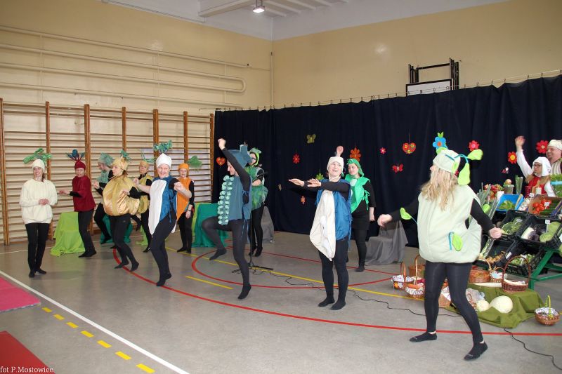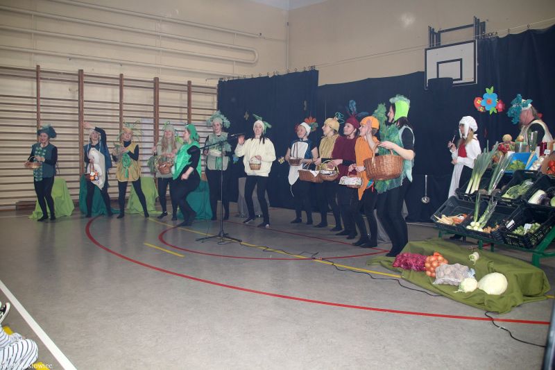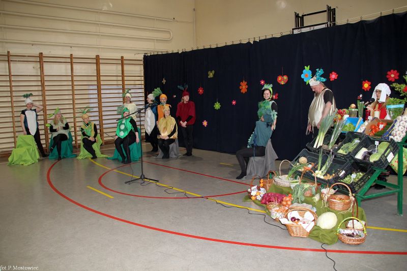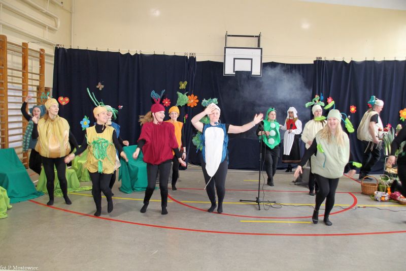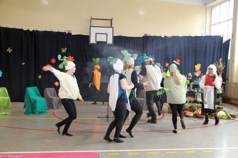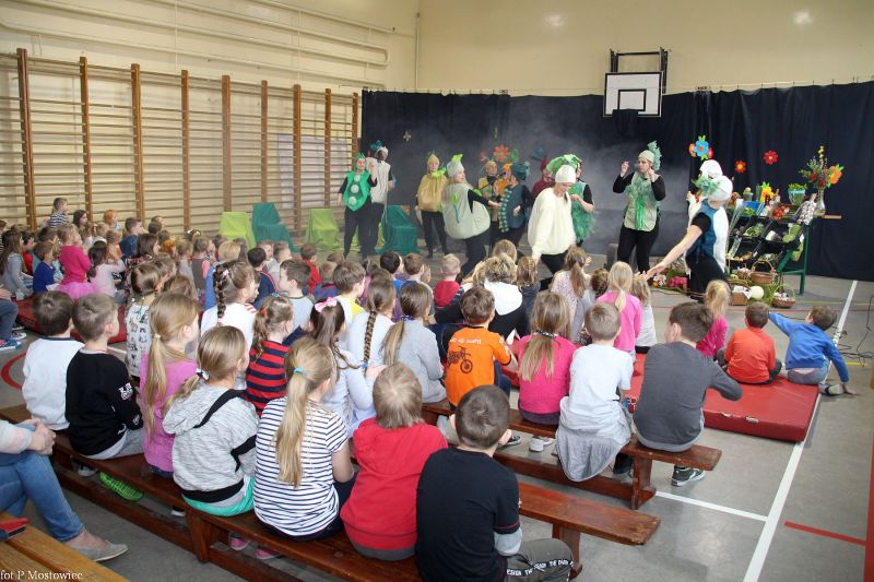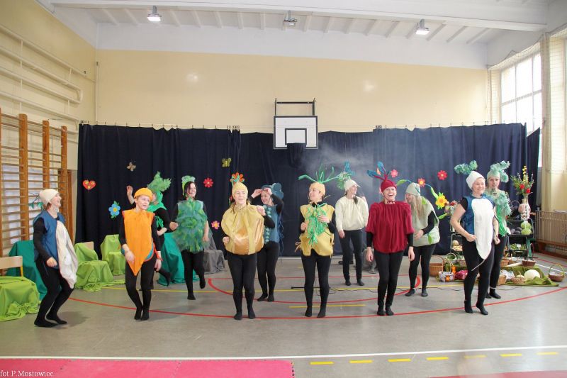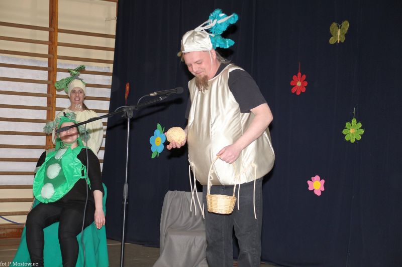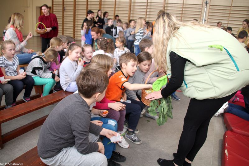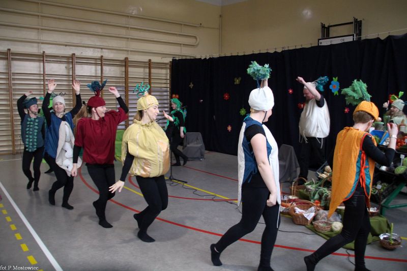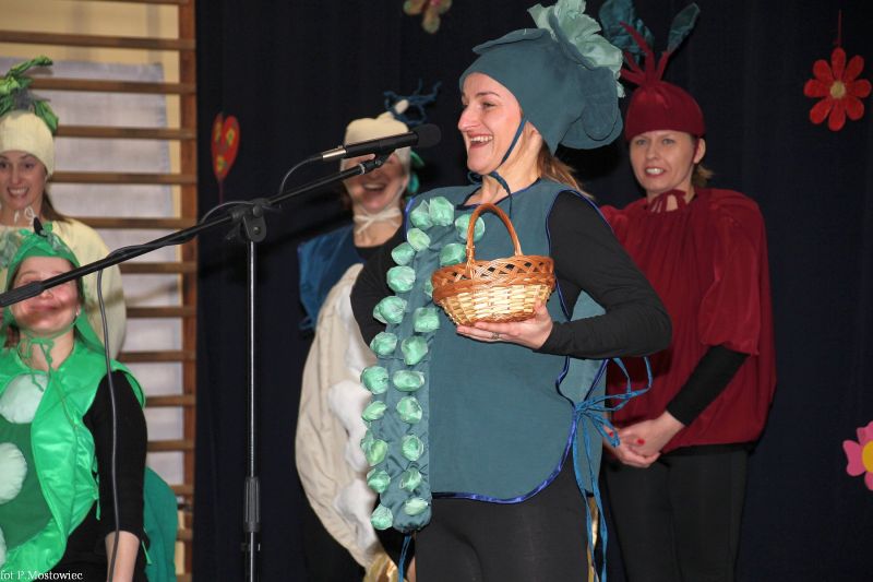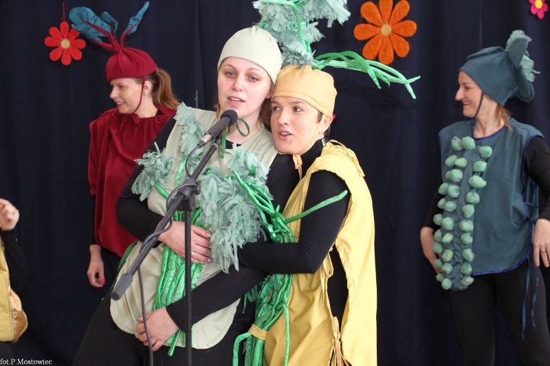 Było to bardzo barwne, pełne humoru przedstawienie na podstawie wiersza Jana Brzechwy „Na straganie”. Fascynująca scenografia, kolorowe kostiumy, wesołe postacie, humorystyczne dialogi oraz cudowny przekaz na temat wiosennych nowalijek, zdrowia i wartości odżywczych, a wszystko to przeplatane skoczną, rytmiczną muzyką wprowadziły wszystkich w radosny, wiosenny nastrój. Na koniec wszyscy mogli spróbować zdrowych, soczystych nowalijek i warzyw przygotowanych w koszyczkach.