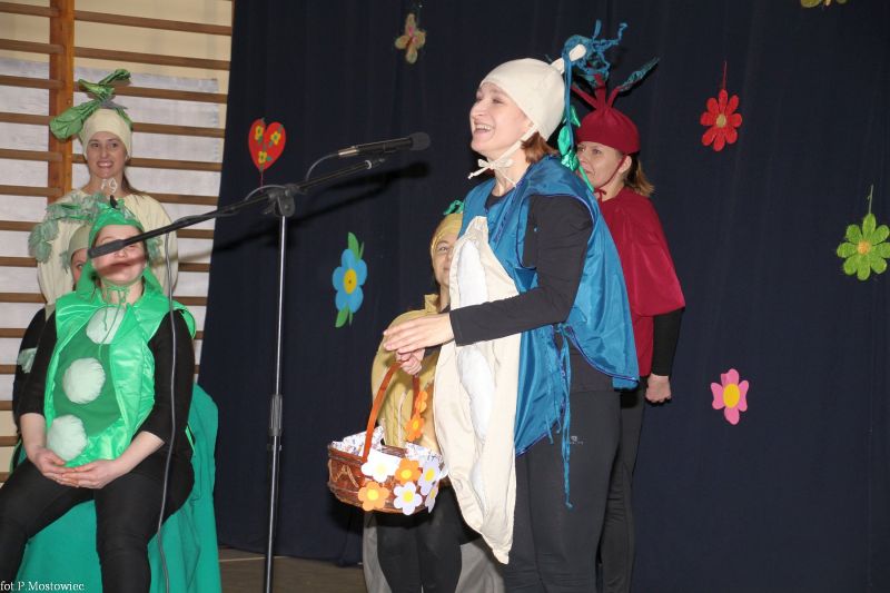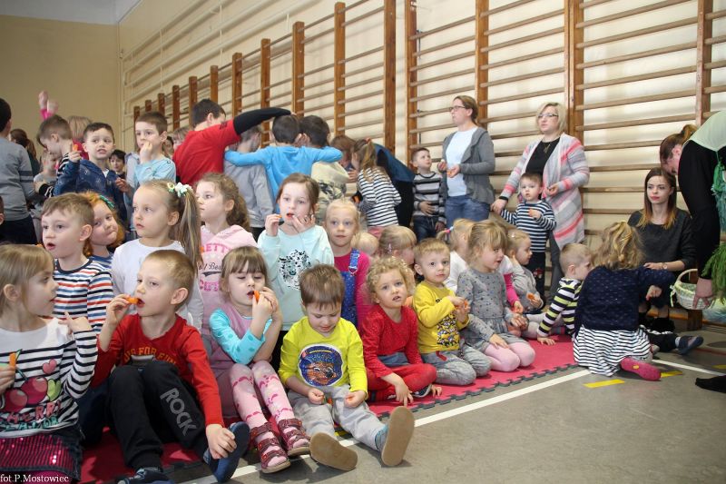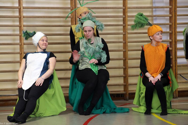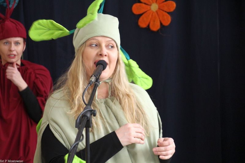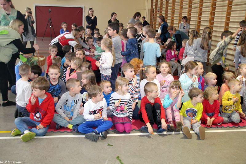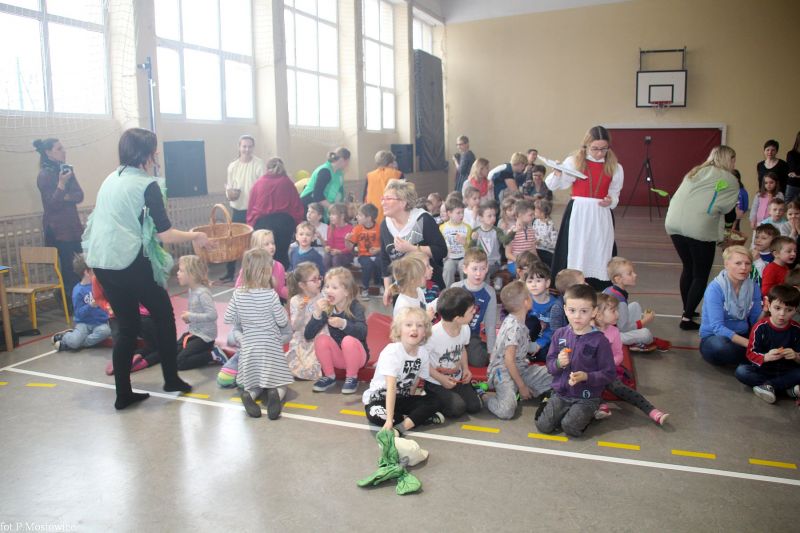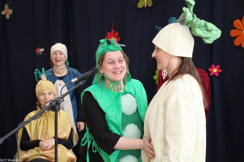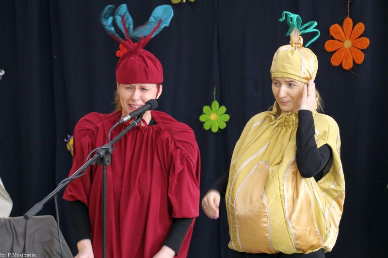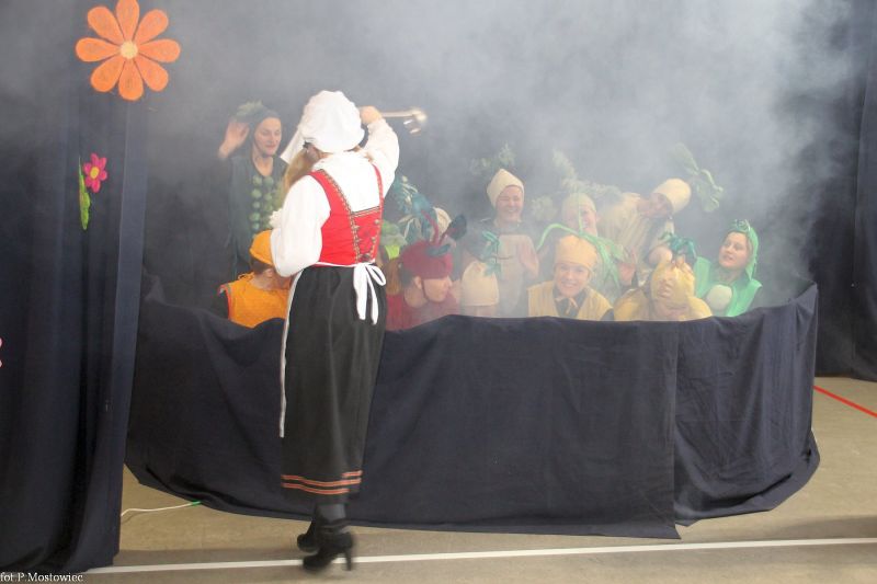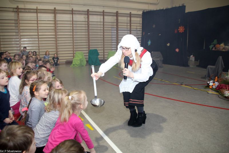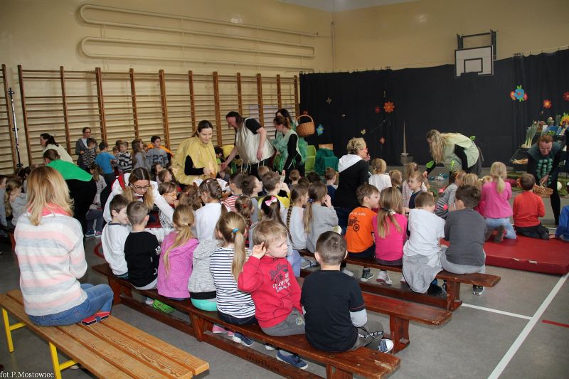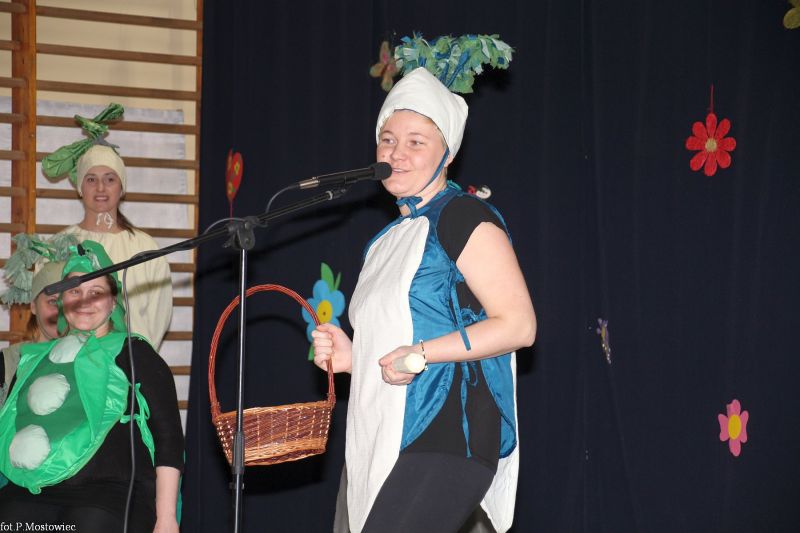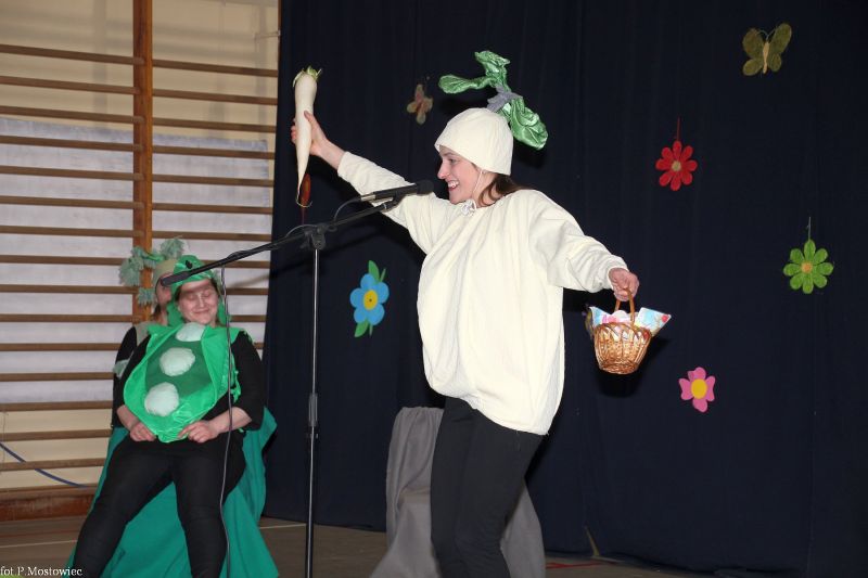 Było to bardzo barwne, pełne humoru przedstawienie na podstawie wiersza Jana Brzechwy „Na straganie”. Fascynująca scenografia, kolorowe kostiumy, wesołe postacie, humorystyczne dialogi oraz cudowny przekaz na temat wiosennych nowalijek, zdrowia i wartości odżywczych, a wszystko to przeplatane skoczną, rytmiczną muzyką wprowadziły wszystkich w radosny, wiosenny nastrój. Na koniec wszyscy mogli spróbować zdrowych, soczystych nowalijek i warzyw przygotowanych w koszyczkach.
