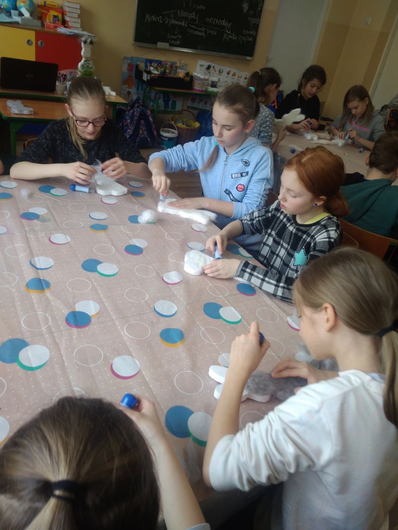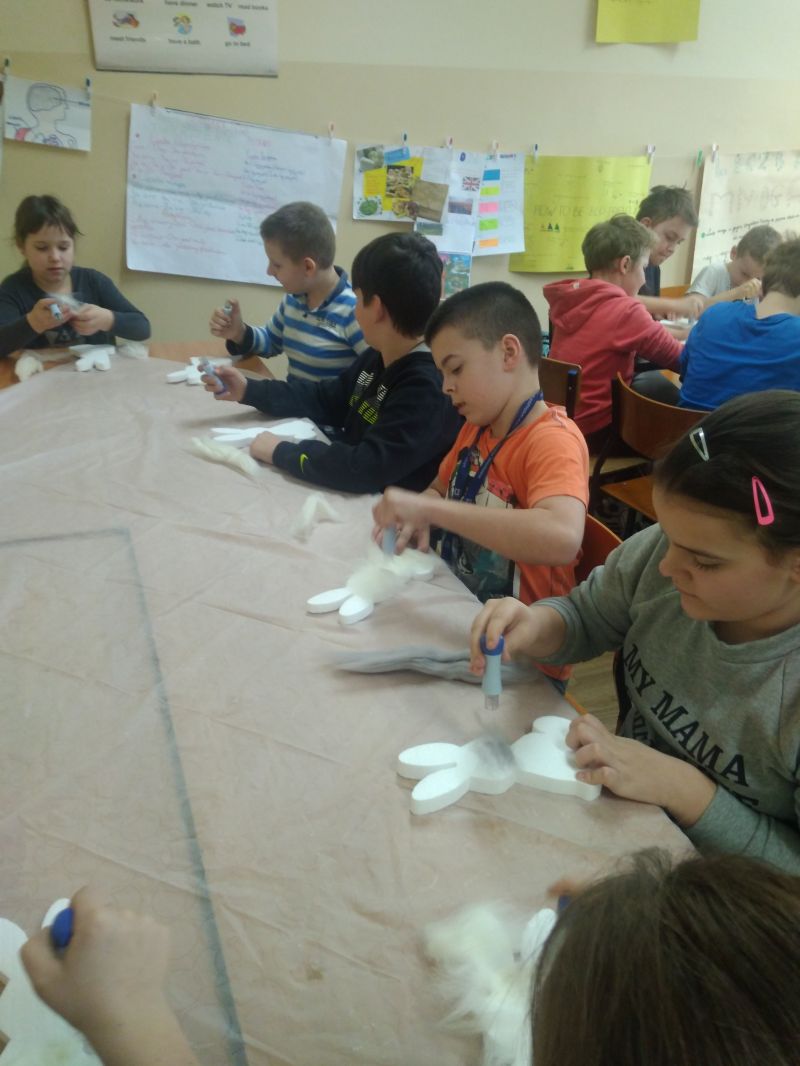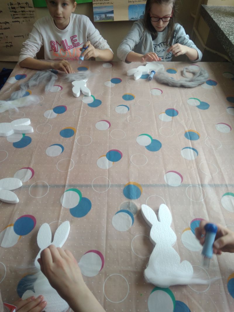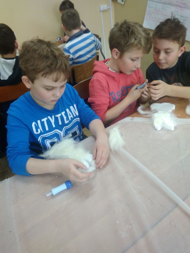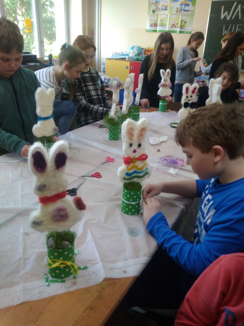 Dzieci wykonywały zajączki techniką filcowania wełny na sucho. Używały do tego specjalnych igieł. Wykonane własnoręcznie ozdoby wielkanocne będą w czasie zbliżających się Świąt dekorowały stoły i zadziwiały zaproszonych gości.