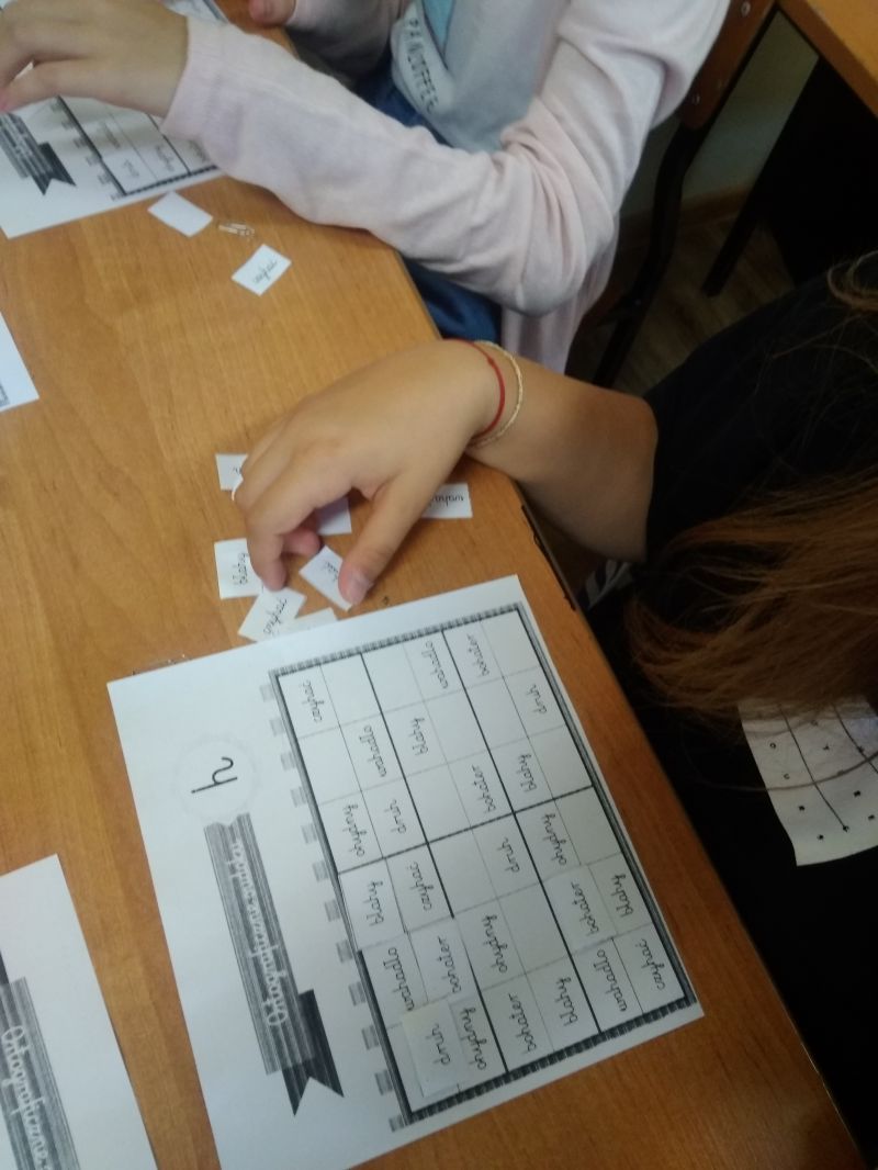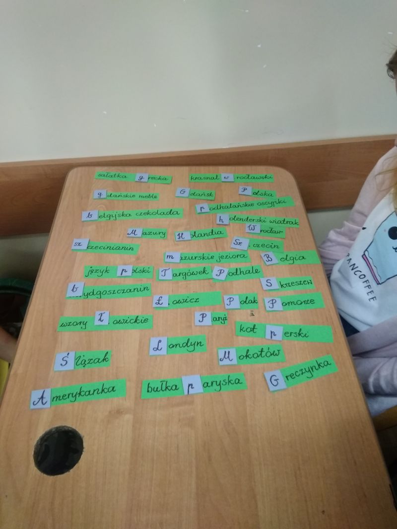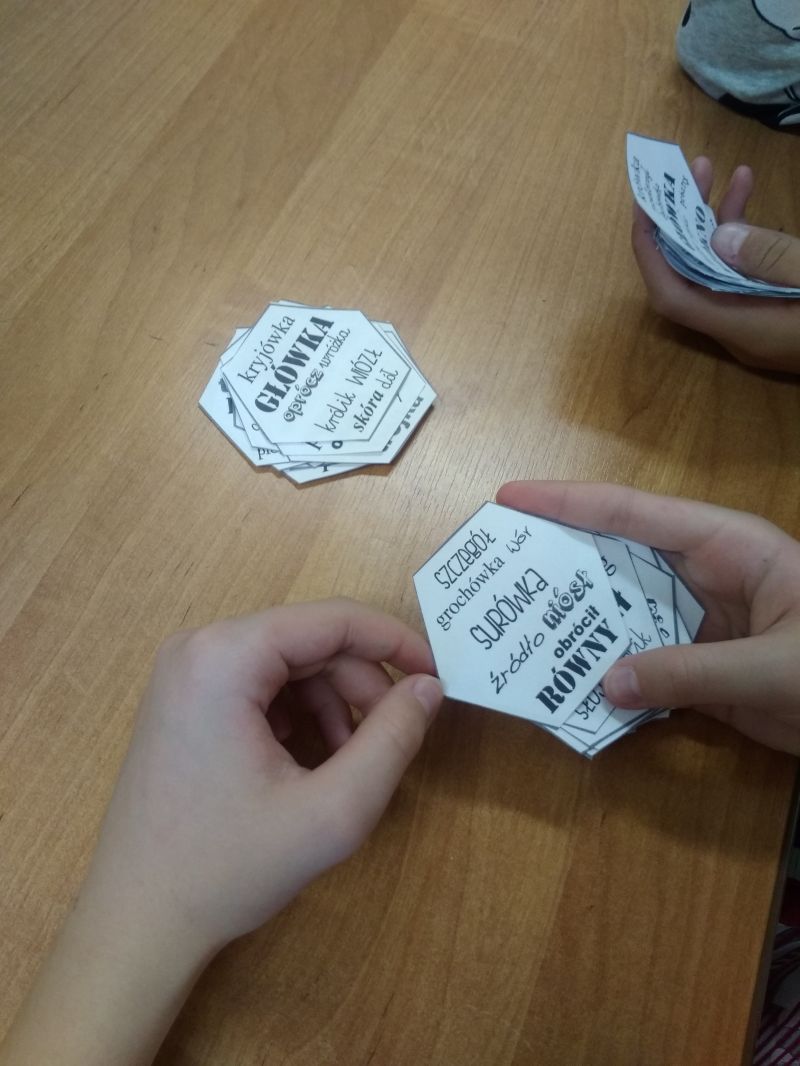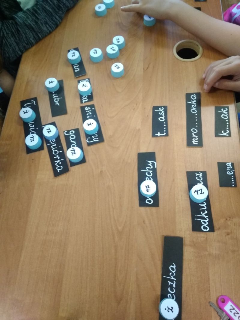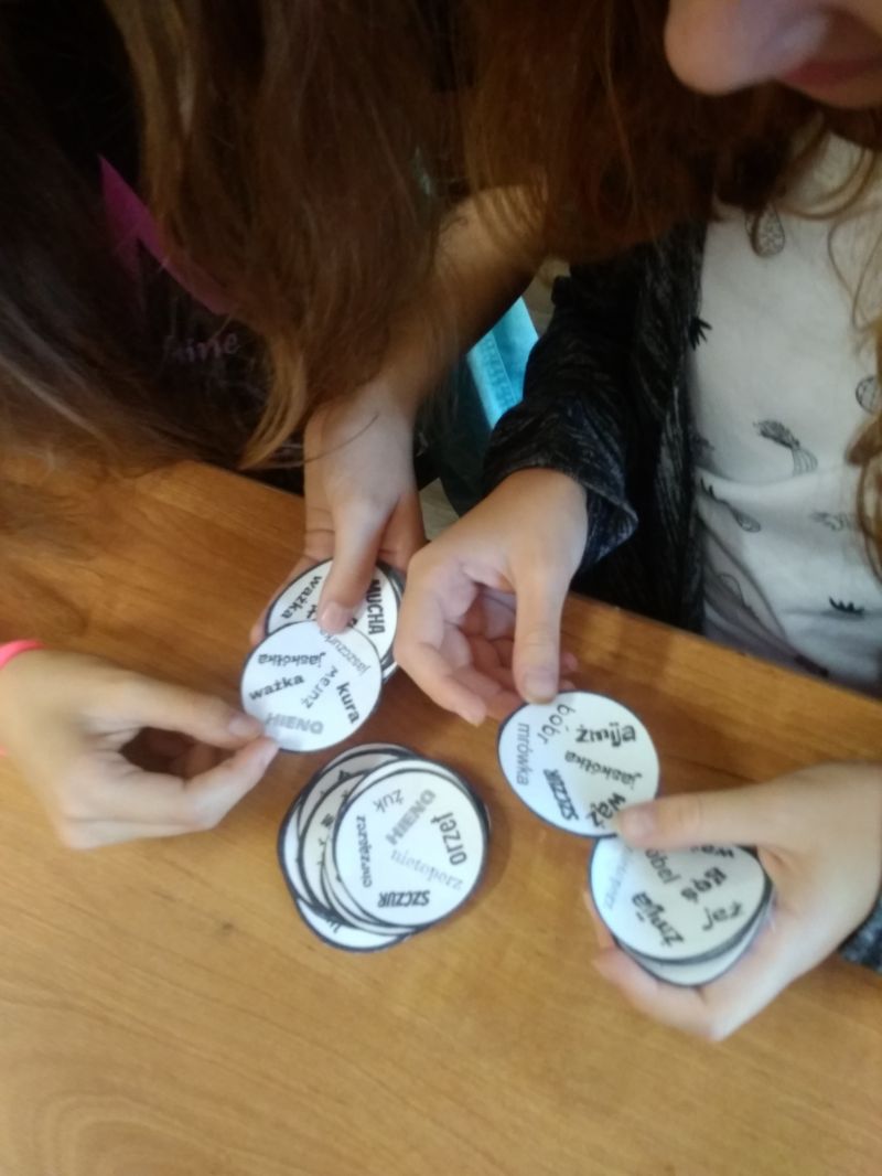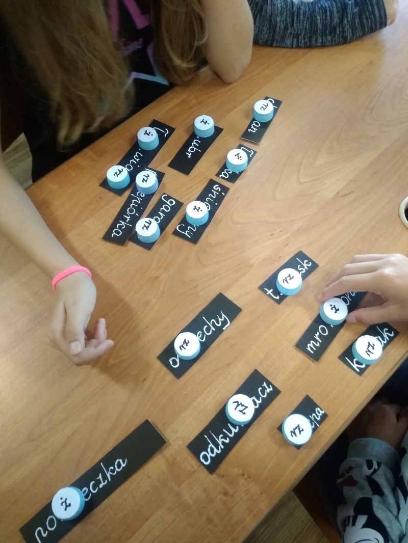 Emocjonującą grą było Dobble ortograficzne. Uczniowie otrzymali kółka z kilkoma wyrazami z trudnością ortograficzną, każdy napisany inną czcionką. Pomiędzy dwiema kartami zawsze jeden wyraz był wspólny. Zabawa polegała na wykładaniu kolejnych kart i równoczesnym odczytaniu wyrazu, który się dokłada przykrywając kartę leżącą na ławce. Dobble wzbudziło wiele emocji. Uczniowie byli zaangażowani, a przy tym doskonalili czytanie i spostrzegawczość oraz …zapamiętywali pisownię wyrazów z trudnościami ortograficznymi.