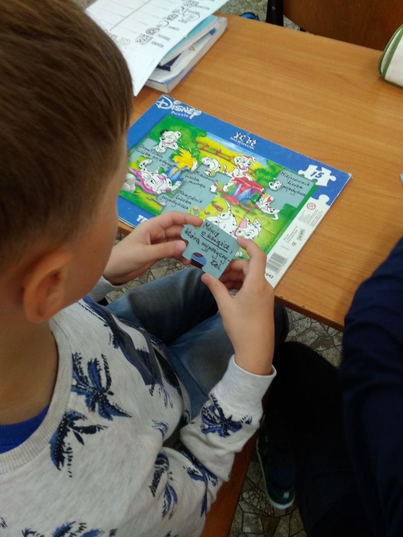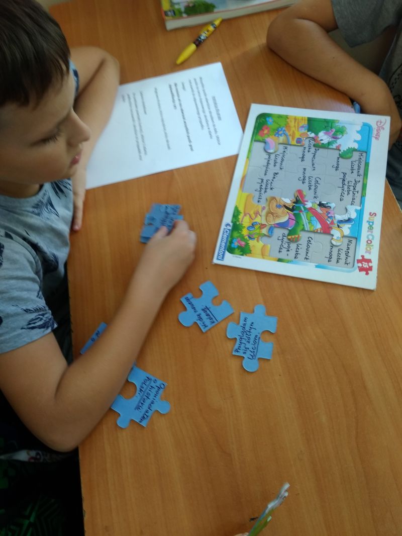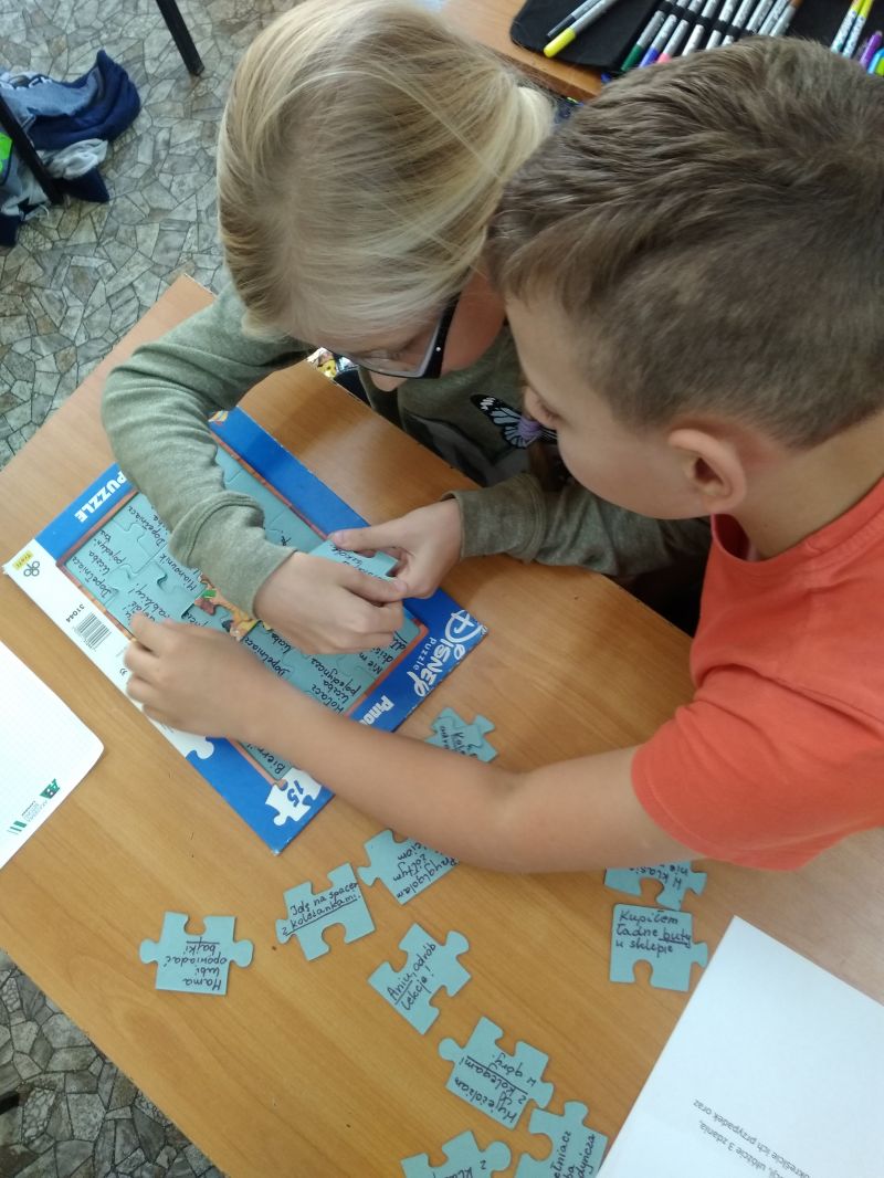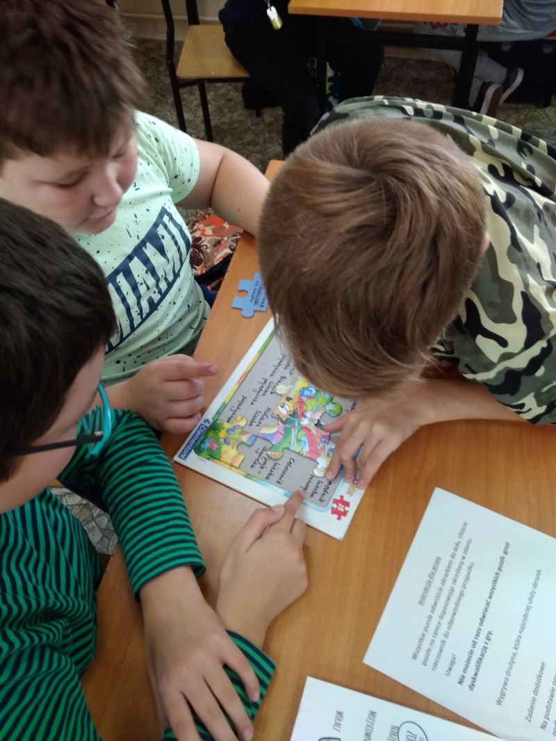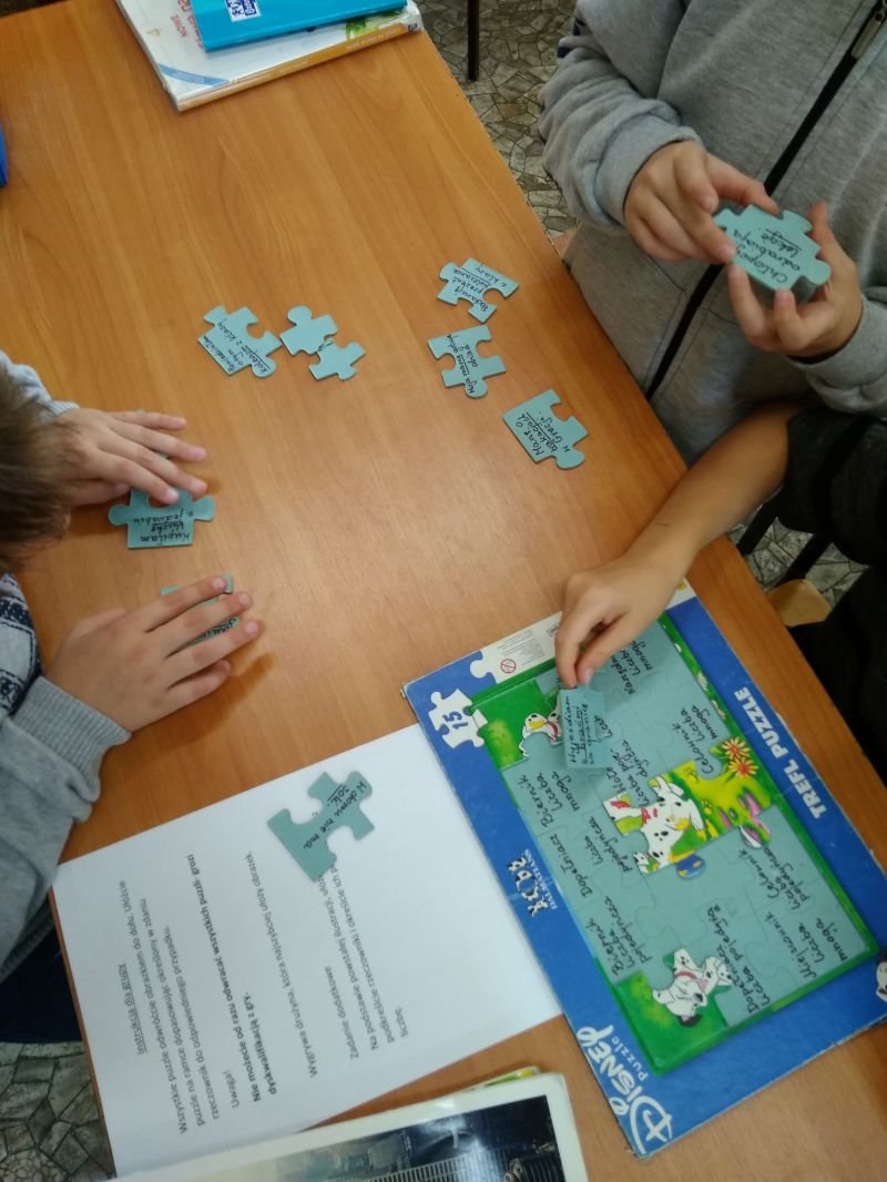 O wiele trudniej radzą sobie z określaniem przypadka danego rzeczownika np. w zdaniu. Do ćwiczenia tej umiejętności wykorzystałam układanki. Na odwrotnych stronach puzzli napisałam zdania z podkreślonymi rzeczownikami. Na podkładce umieściłam przypadki i liczby. Zadaniem uczniów było dopasowanie elementu z podkreślonym zdaniu rzeczownikiem do odpowiedniego przypadka i liczby na podkładce. W miarę postępów prac ukazywał się obrazek. Ćwiczenie wywołało u uczniów wiele emocji. Dzieci pracowały w grupach i były bardzo zaangażowane w wykonanie zadania.