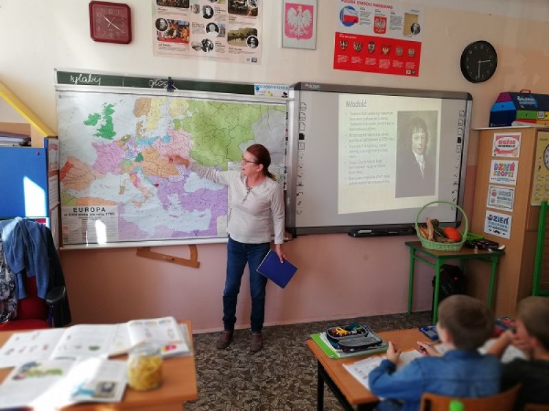 Uczniowie chcieli poznać patrona tej szkoły dlatego poprosiliśmy Panią Jolantę Boniecką nauczyciela historii aby przybliżył nam tą Ważną postać historyczną. Pani Jola opowiedziała nam o Tadeuszu Kościuszko jak również zaprezentowała prezentacją multimedialną. Następnie przygotowaliśmy kartki urodzinowe w kształcie książki. Własnoręcznie i z duża starannością napisaliśmy życzenia , które wspólnie ułożyliśmy. Życzymy szkole wszystkiego najlepszego .