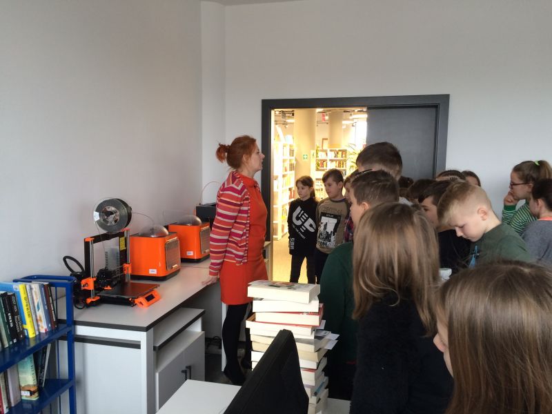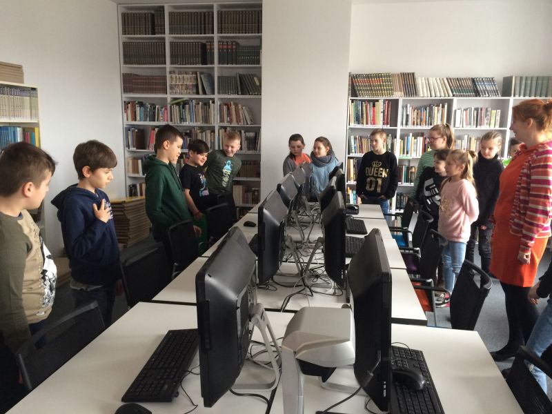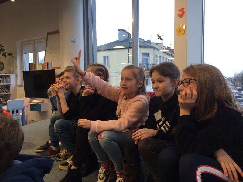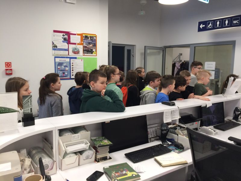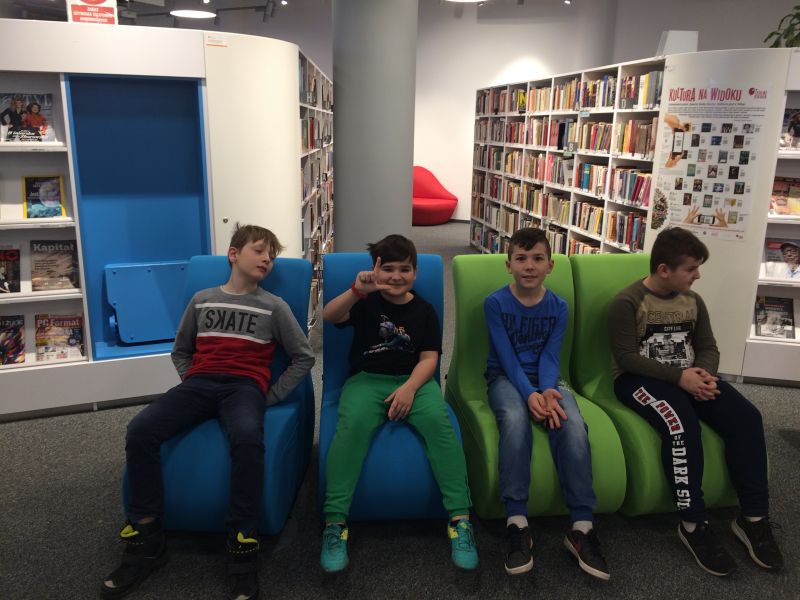 Dzieci wzięły udział w lekcji bibliotecznej i zapoznały się z zasadami funkcjonowania biblioteki mieszczącej się w tym samym budynku, co stacja kolejowa. Uczniowie z zainteresowaniem słuchali pani edukatorki, zadawali wiele ciekawych pytań i z zaangażowaniem wyszukiwali ciekawe pozycje książkowe wśród bogatego księgozbioru Poczytalni.