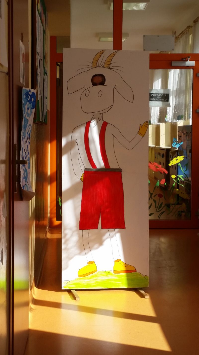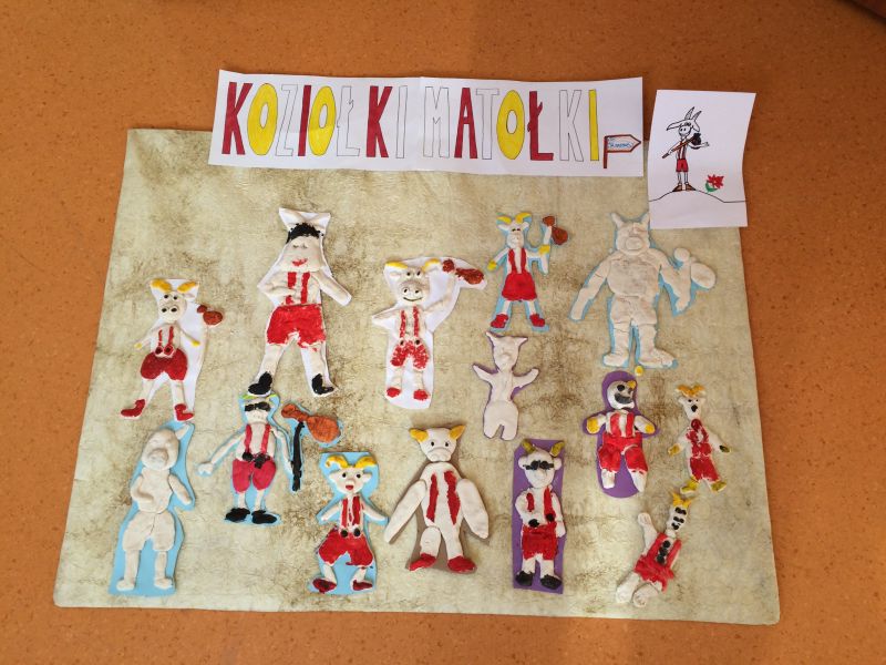 Na korytarzu można było też zrobić sobie zdjęcie z wykonanym z tektury Koziołkiem Matołkiem oraz podziwiać jego przesympatyczne podobizny z masy solnej, wykonane wg osobistej i nieskrępowanej wizji twórczej najmłodszych podopiecznych świetlicy szkolnej.