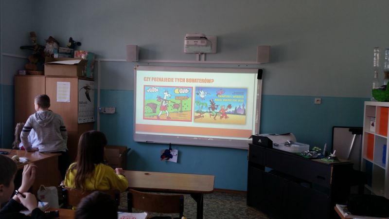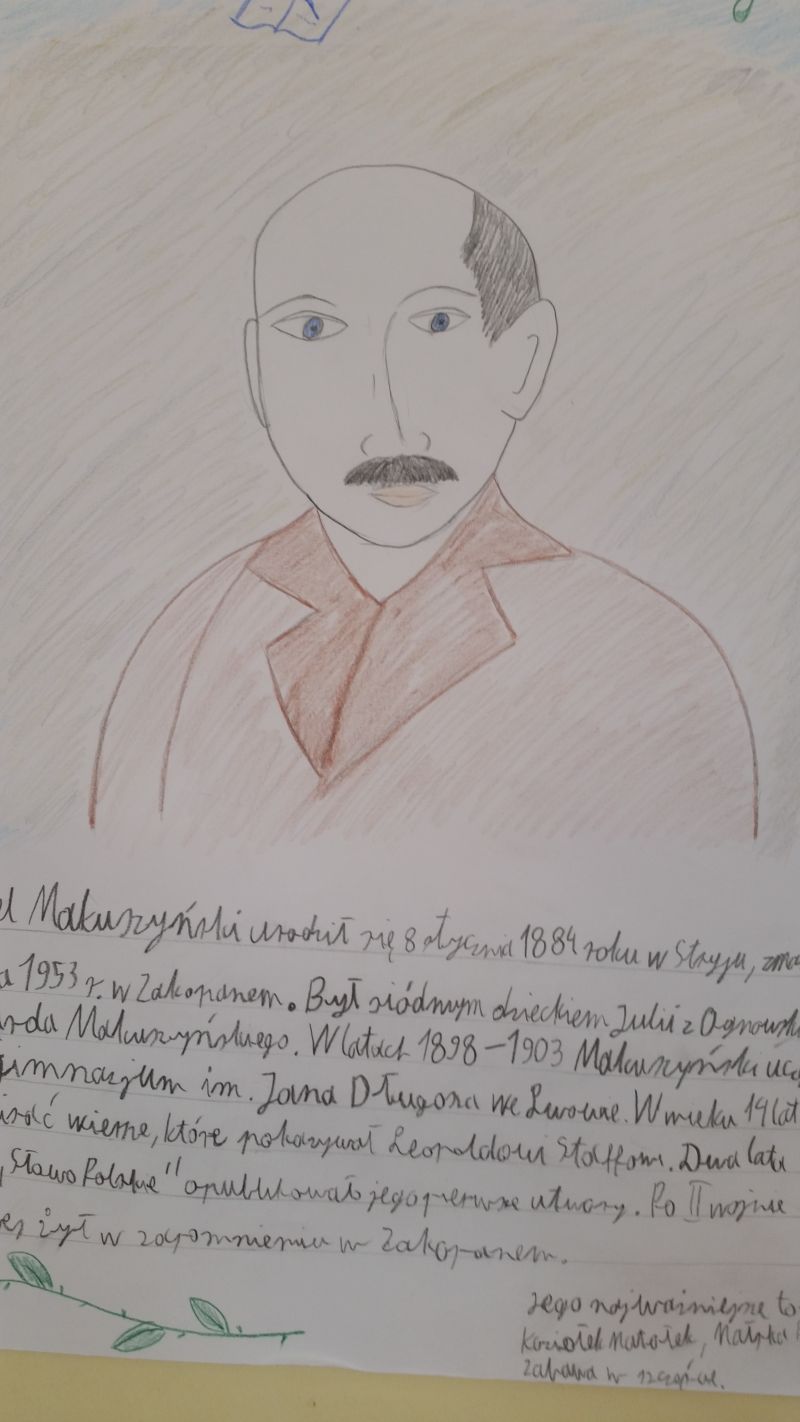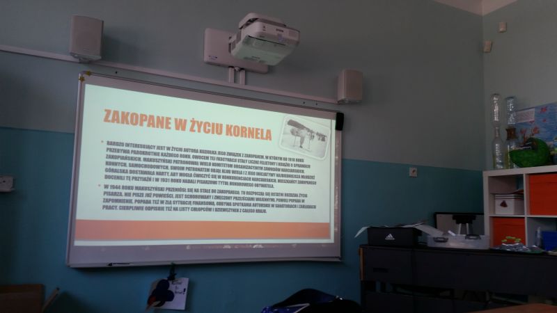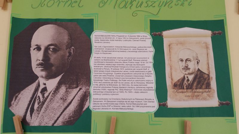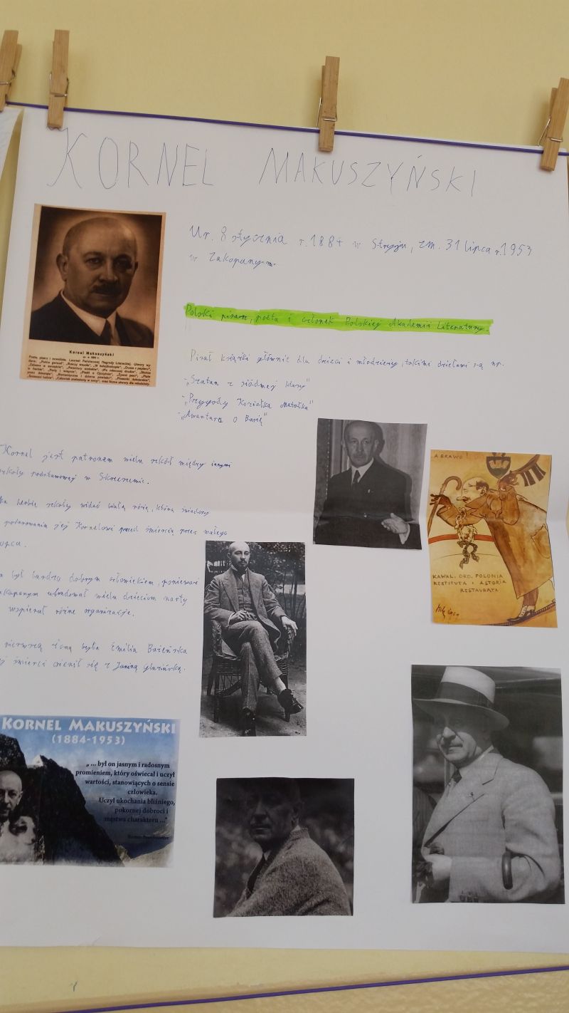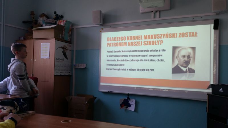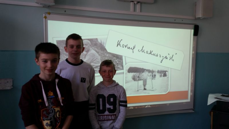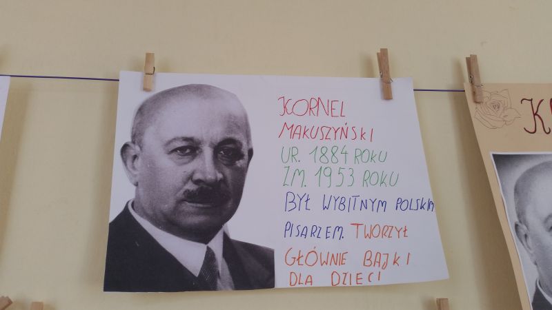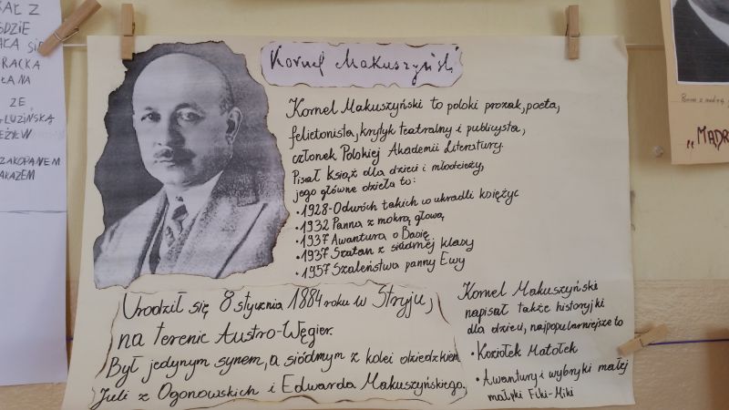 Uczniowie klasy 6a – Szymon Buczek, Bartosz Buczek i Filip Krakowiecki, przygotowali prezentację multimedialną o życiu i twórczości Kornela Makuszyńskiego. Chłopcy odwiedzili wszystkie klasy przedstawiając swoje dzieło.