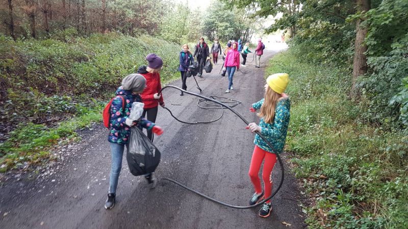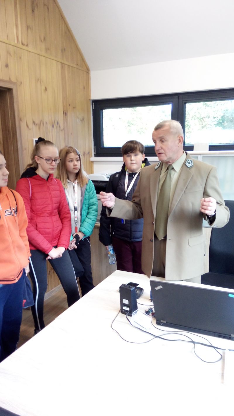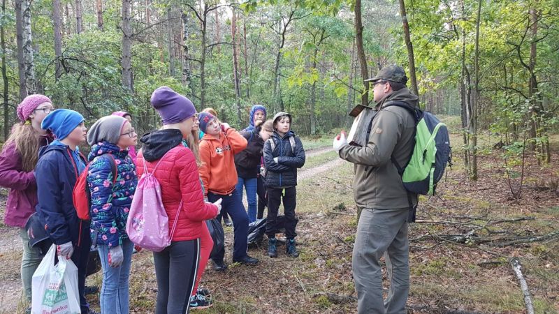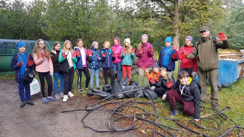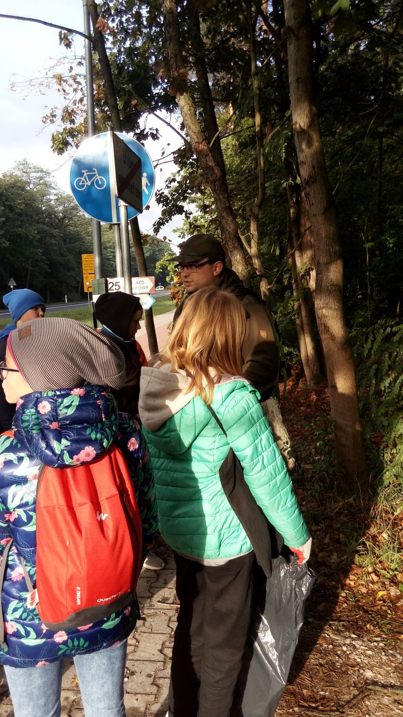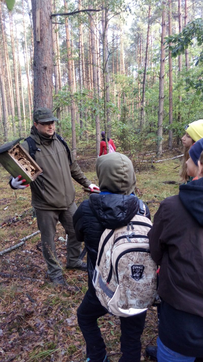 Po krótkim powitaniu z przez pana leśniczego R.Kołakowskiego i podleśniczego H.Wróblewskiego i zapoznaniem z funkcjonowaniem kancelarii wyruszyliśmy w teren. Oprócz zbierania odpadów mieliśmy okazję dowiedzieć się na czym polega praca leśnika, dlaczego ważna jest różnorodność gatunkowa, do czego w lesie służą słupki z numerami ,czym różni się metr przestrzenny drewna od metra sześciennego. Mieliśmy okazję zaobserwować że w budce lęgowej zamiast ptaków mogą mieszkać szerszenie. Dotarliśmy aż do zbiornika przeciwpożarowego ,który obecnie jest ostoją żurawi i czapli i rosną tam okazałe kanie. Wśród zebranych odpadów najwięcej było szklanych i plastikowych butelek ale najciekawszy znaleziskiem okazał sie kilkunastometrowy kabel nazwany przez nas pytonem. Leśna lekcja po raz kolejny uświadomiła nam, by wszystkie puste opakowania zabierać z lasu do domu bo,, jak przyniosłeś pełne masz siłę wynieść puste’’