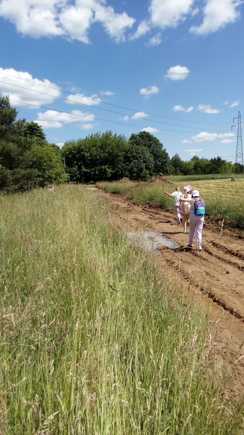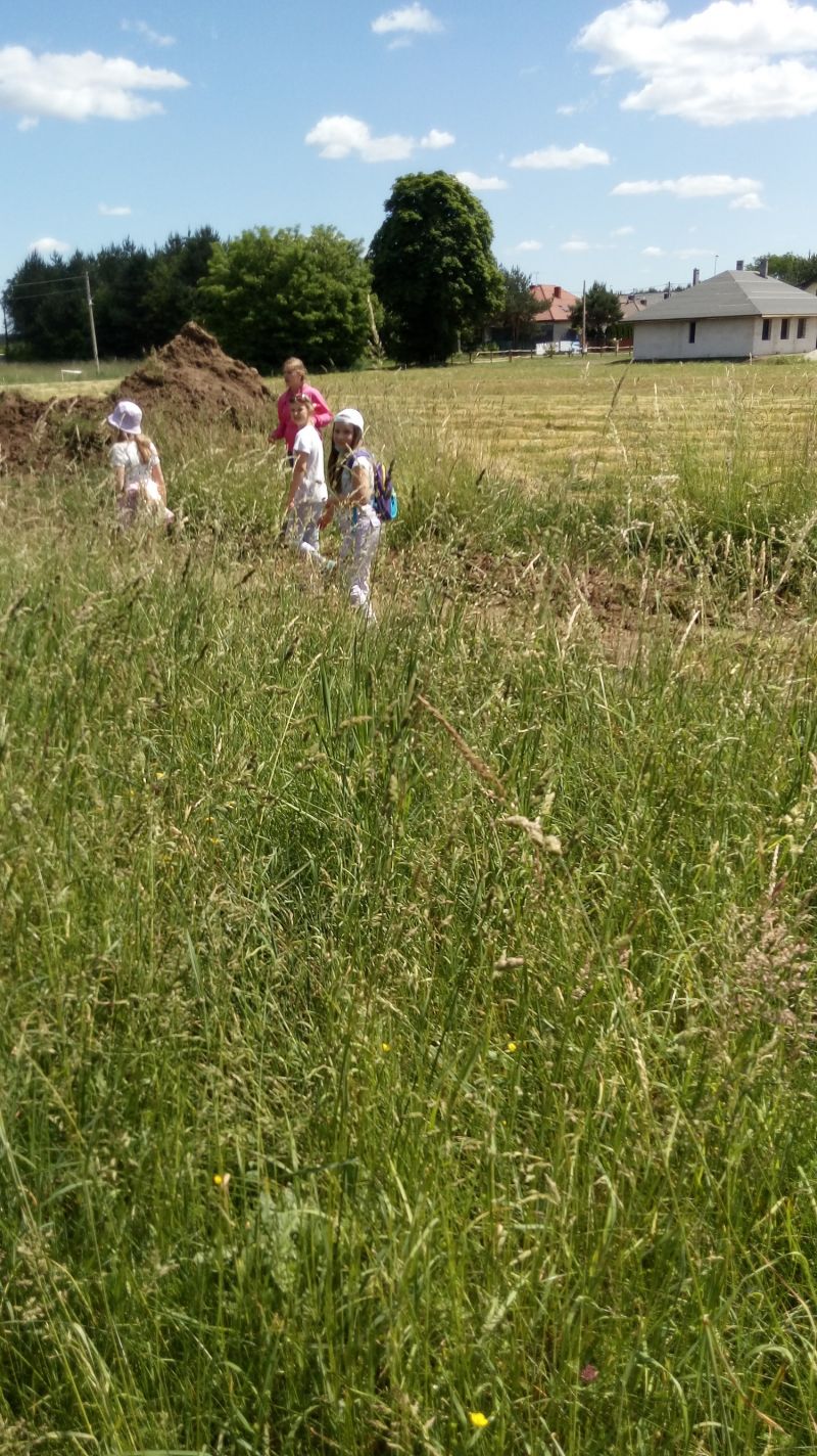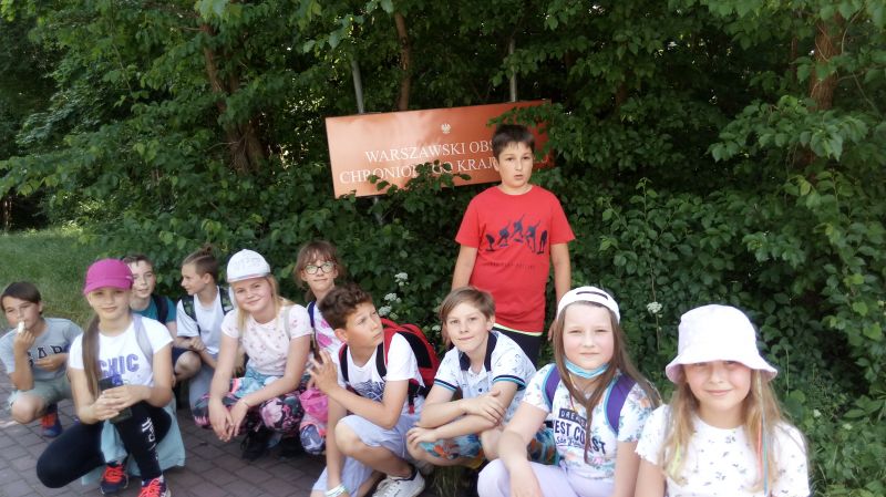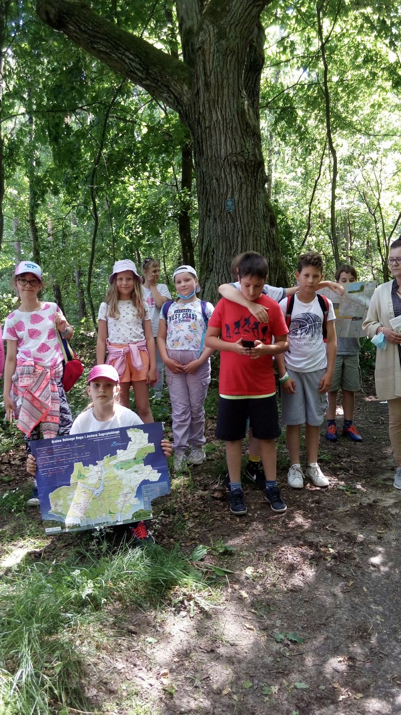 Najpierw maszerowali fragmentem leśnej trasy WTC mtb. Po drodze rozpoznawali gatunki drzew i poznawali chronione gatunki runa leśnego, takie jak kokoryczka czy konwalie. Celem było dotarcie do pomników przyrody, 2 okazałych dębów na skraju lasu przy tzw. polu strachów. Dzieci z łatwością odnalazły to miejsce na mapie Gminy Wieliszew. Przy okazji zapoznały się z tablicą punktu 11 -Polskie lotnisko polowe z września 1939 Szlaku patriotycznego ,,Polski walczącej ”. Następnie, wędrując drogą wśród bujnych traw wzdłuż łąki i pola ze strachami, dotarliśmy do granicy Obszaru chronionego krajobrazu przy mostku, a na koniec do sklepu, by ochłodzić się lodami. Ostatnią atrakcją dla spragnionych ruchu był stok wiaduktu doskonale nadający się do wspinania i zbiegania. Zajęcia terenowe okazały się bardzo owocne, łącząc aktywność fizyczną, historię i przyrodę.