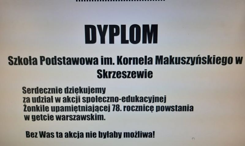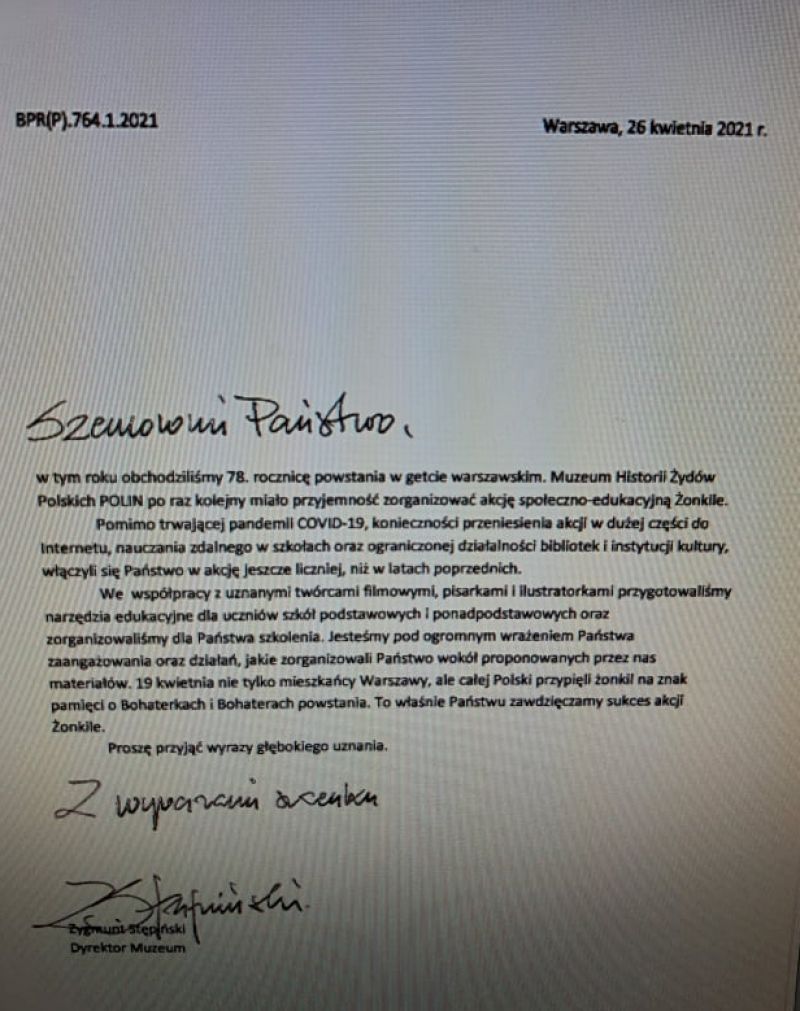 Nasza szkoła przystąpiła w tym roku szkolnym do Ogólnopolskiej Akcji „Żonkil. Łączy nas pamięć”, realizując w szkole projekt polonistyczny „Ocalić od zapomnienia”. Muzeum Żydów Polskich Polin przygotowało piękne podziękowania dla społeczności szkolnej za pamięć i realizację projektu.