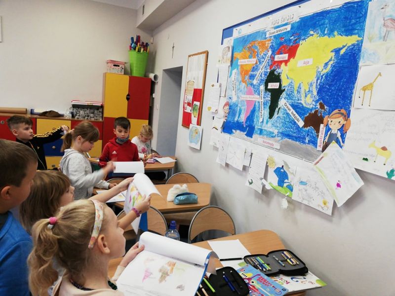 Odbywając wirtualną podroż po kontynencie zatrzymaliśmy się w Afryce. Poszerzyliśmy swoją wiedzę na temat kultury, roślinności, panującego klimatu. Każdy z uczniów przygotował i zaprezentował ciekawostki dotyczące zwierząt żyjących na tym kontynencie. Na lekcji informatyki za pomocą znanych nam programów stworzyliśmy pierwsze strony albumu wirtualnego podróżnika.