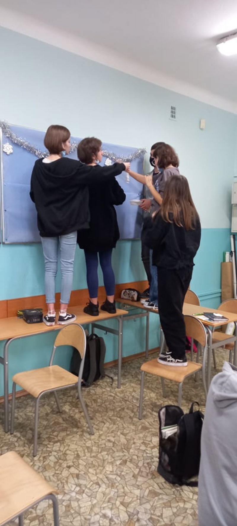 Uczniowie klasy 7b przyłożyli w tym roku ogromne starania, aby ich sala numer 4 była piękną i bożonarodzeniowa. Dzieci wykonały samodzielnie gazetkę ścienną o tematyce zimowej, ubrały choinkę i z pomocą wychowawcy przygotowały stroiki, które upiększają parapety okienne. W piątek 17 grudnia odbyła się wigilia klasowa, w prawdzie nietypowa, bo na życzenie uczniów zamiast tradycyjnych potraw pojawiła się pizza, ale atmosfera pozostała niezmienna – radosna i rodzinna.