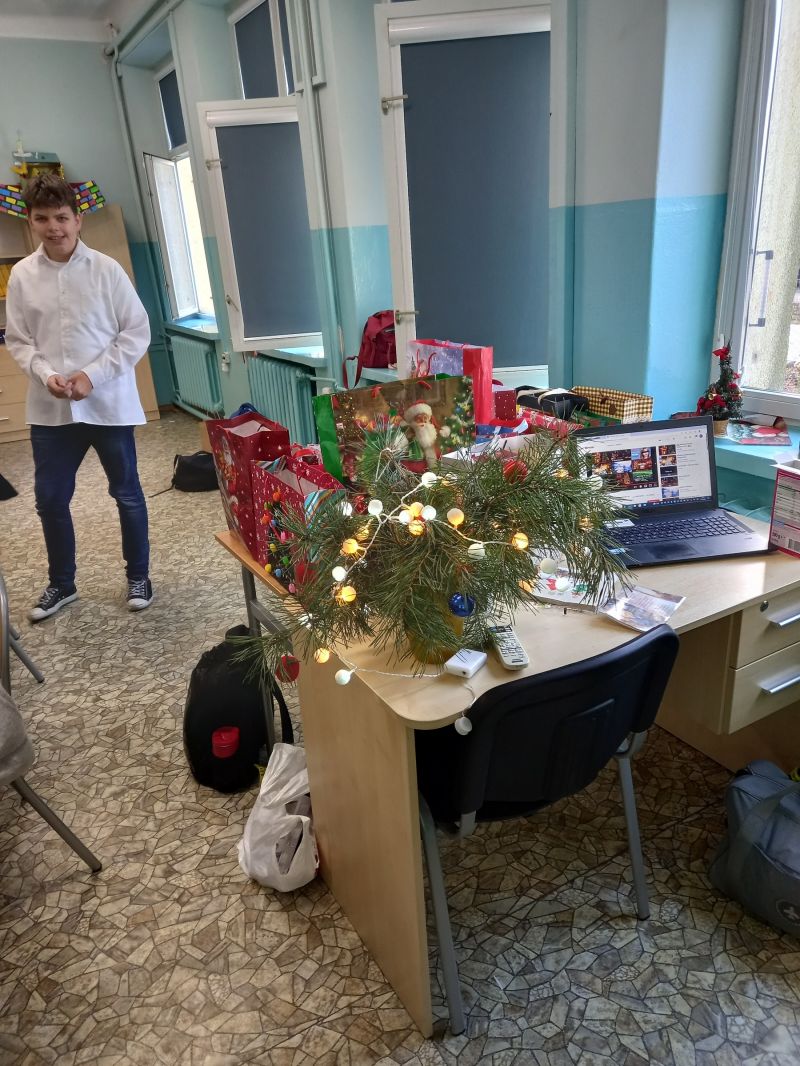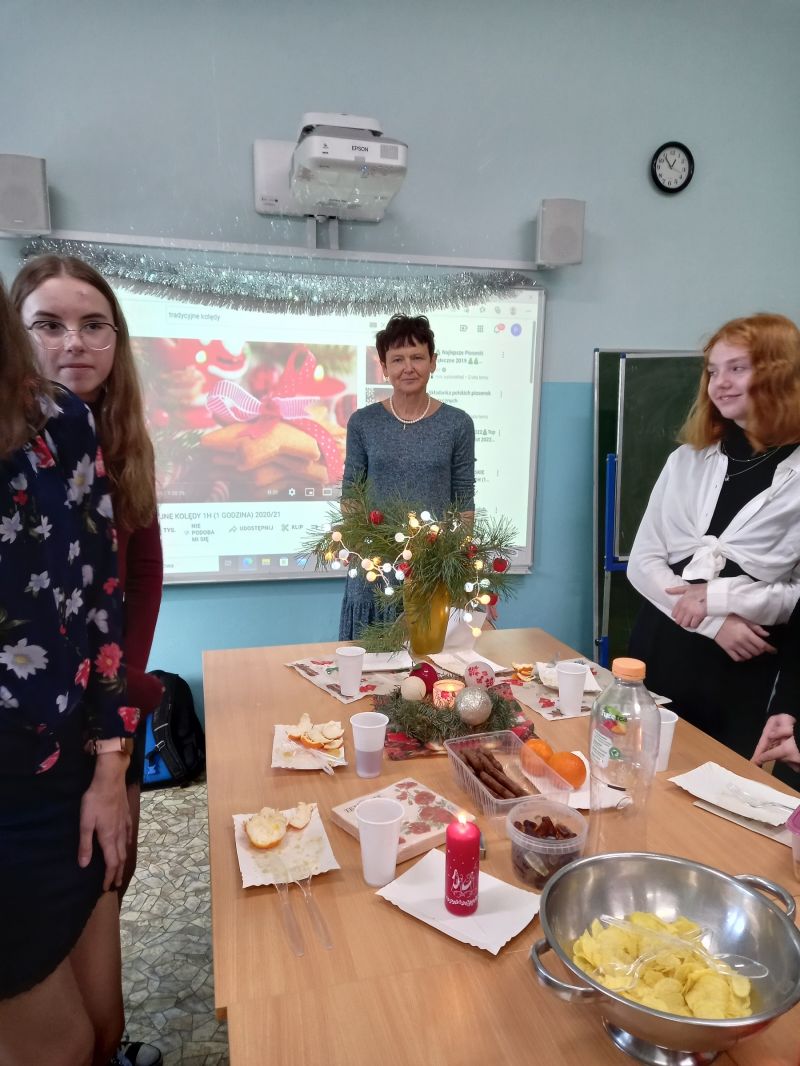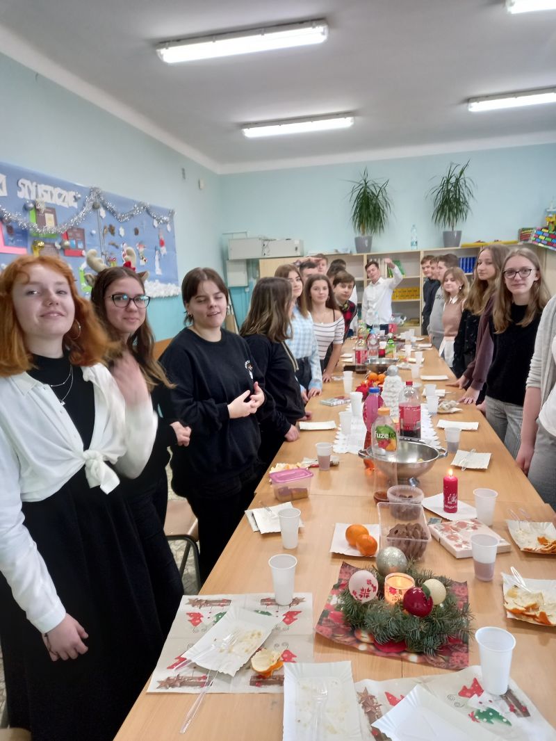 Na stole pojawiła się świeca i opłatek,pod obrusem siano ;nie zabrakło choinki pod którą wszyscy znaleźli prezenty.W rolę mikołaja wcielił się najmłodszy uczeń.Na stole królowały pierniki i pachnące pomarańcze.Śpiewaliśmy kolędy i składaliśmy życzenia.To spotkanie na pewno wszyscy zapamiętają .