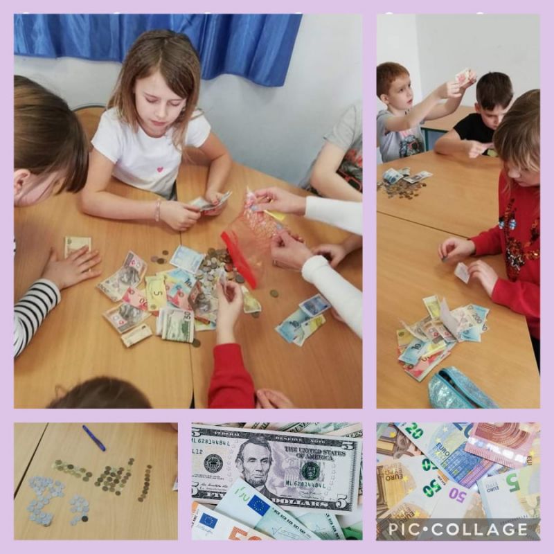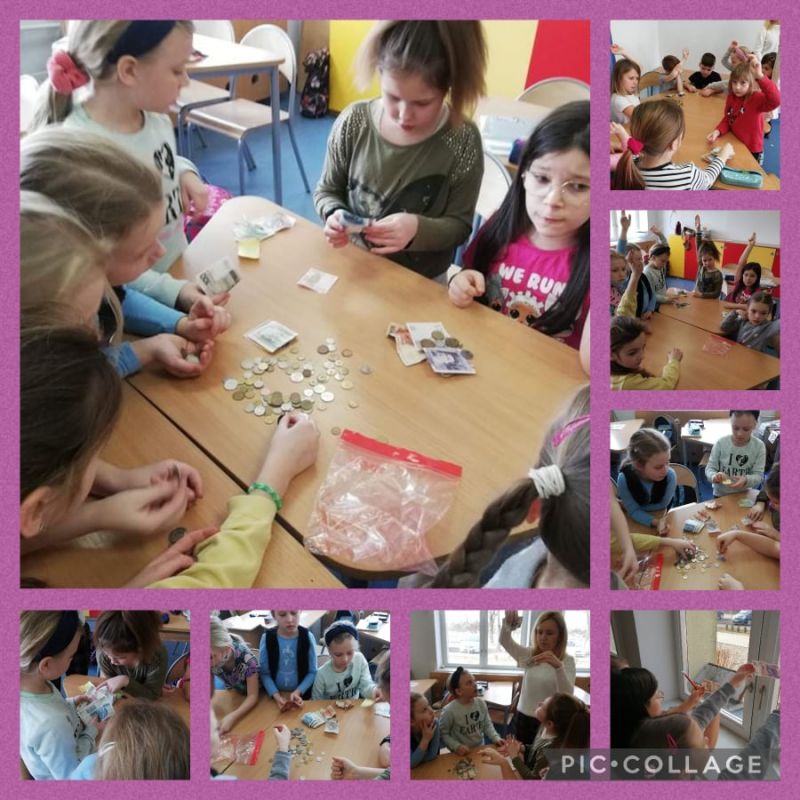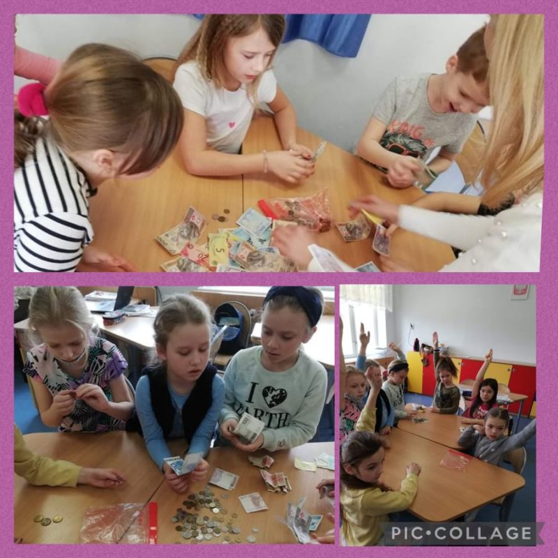 Odbyliśmy już pierwsze podróże. Utrwaliliśmy podstawowe pojęcia: banknot, moneta, awers, rewers, nominał. Wiemy skąd się biorą pieniądze i jaka jest ich rola. Największą radość uczniom sprawiła praca grupowa w czasie której mogli wykazać się zdobytą wiedzą i umiejętnościami praktycznymi. Zadaniem uczestników poszczególnych zespołów było pogrupowanie pieniędzy ze względu na hierarchię ich wartości. Uczniowie segregowali również banknoty i monety na te, które znajdują się w obiegu na terenie RP oraz pieniądze zabawkowe. Przy okazji dzieci poznały pieniądze obowiązujące w innych krajach. Ponadto uczniowie doskonalili umiejętności dokonywania obliczeń pieniężnych oraz poznali zabezpieczenia banknotów.