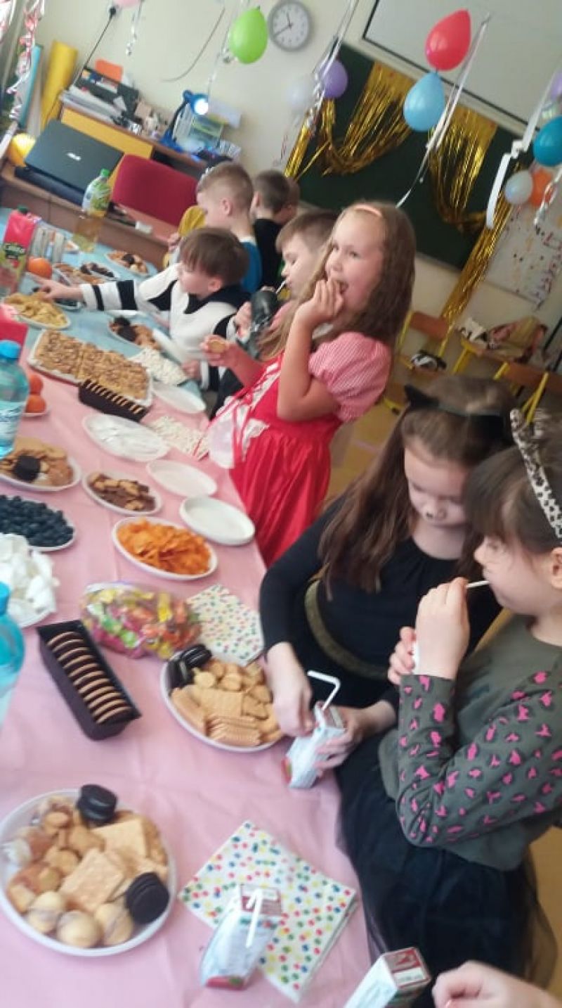 Uczniowie zaprezentowali swoje stroje , uczestniczyli w konkursach i zabawach karnawałowych. Najlepsze było ?.......... taneczne szaleństwo i słodki poczęstunek.