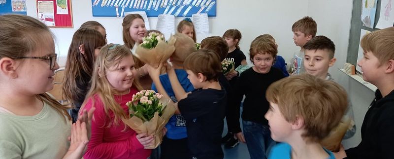 Tego dnia chłopcy z klasy 2b przygotowali dla swoich koleżanek z klasy pachnące upominki, serdeczne życzenia, tańce piękne portrety. Miło spędziliśmy ten dzień.