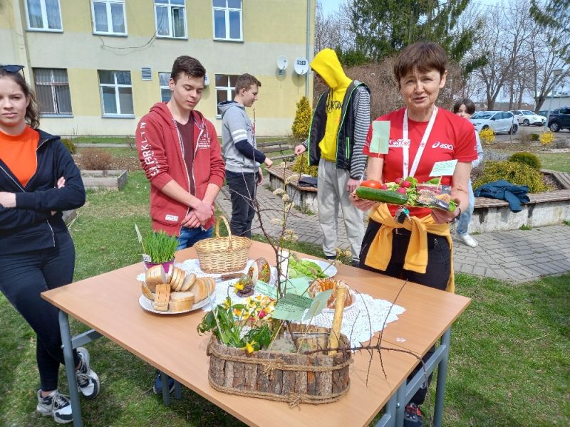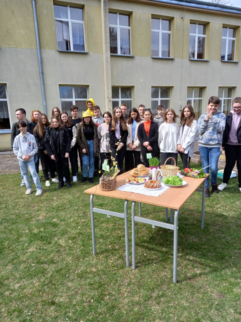 Na stole udekorowanym owsem,żonkilami,barwinkiem pojawiły się jajka,chleb,nowalijki czekoladowe pisanki i babka.nie mogło zabraknąc świecy i figurek baranka ,zajączka i kurczaka oraz olbrzymiej pisanki.Złożliśmy sobie życzenia i dzieliliśmy się jajkiem i chlebem.To spotkanie długo pozostanie w naszej pamięci jako ostatnie w szkole podstawowej.