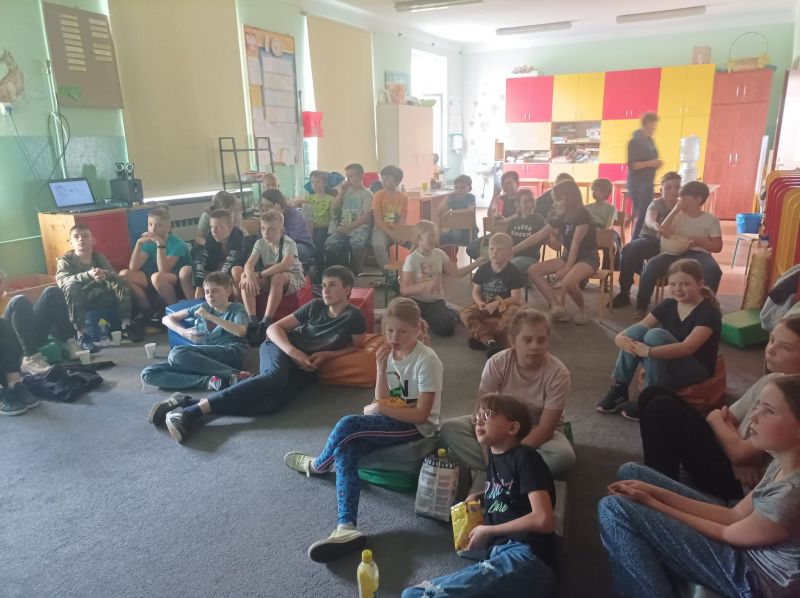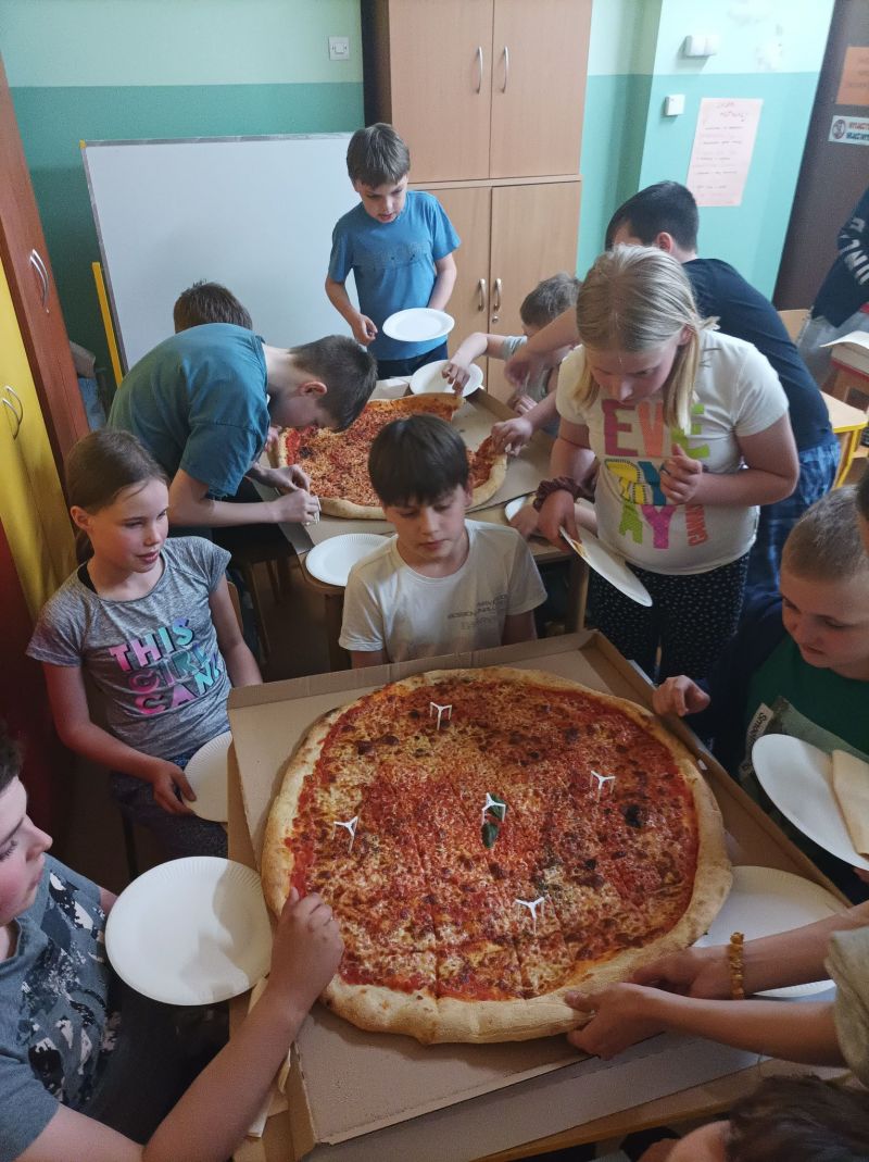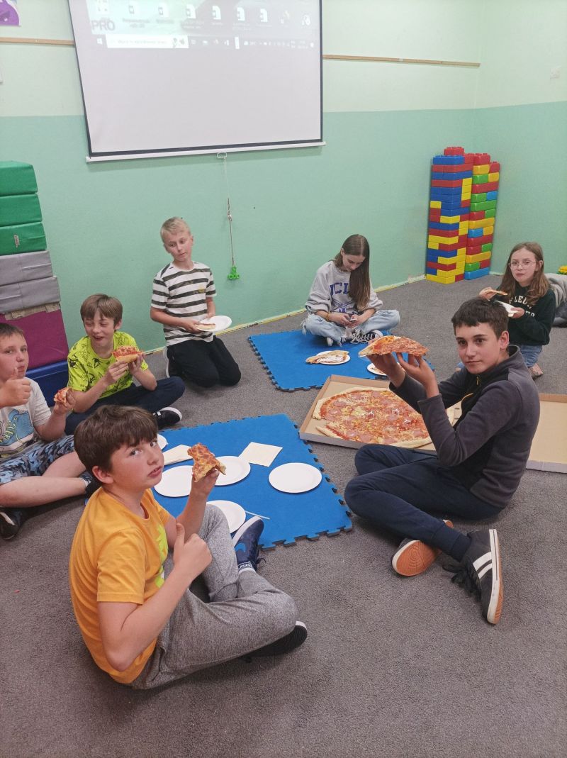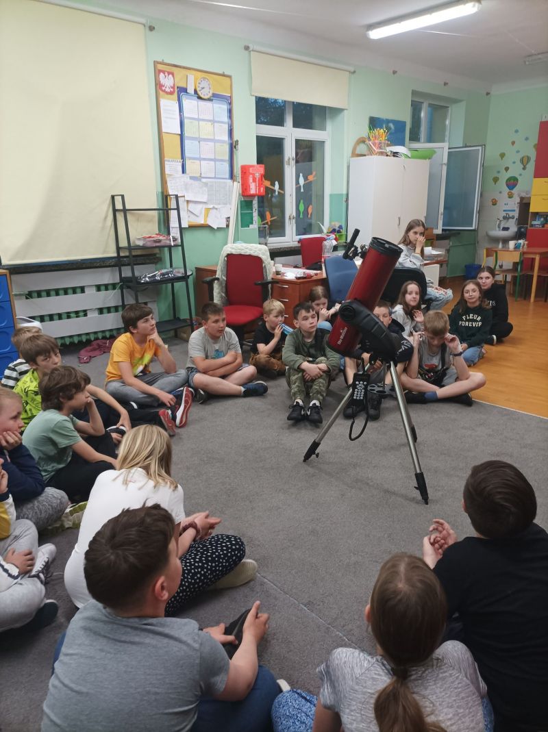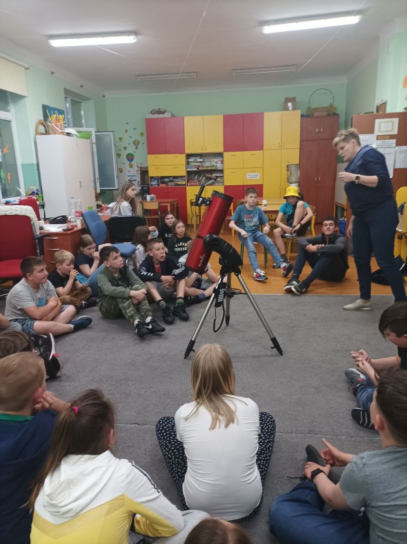 Pierwszym punktem programu było wyświetlenie filmu o tematyce istot pozaludzkich, opowiadający historii o przyjaźni między 10-cio letnim chłopcem a przybyszem z kosmosu. Film zachwycił dzieci, wzruszył i wielokrotnie rozbawił. Następnie uczniowie zostali wprowadzeni w tematykę gwiazdozbiorów. Dowiedzieli się od czego zależy kolor gwiazdy, mogli zapoznać się z gwiazdozbiorami zwierząt i nie tylko, mogli nauczyć się jak odszukać na nieboskłonie swoje pierwsze konstelacje gwiazd. Uczniowie zaglądali przez teleskop, który od niedawna jest własnością naszej szkoły. Każdy miał szansę podejrzeć swoją wyszukaną gwiazdę. Dla głodomorów również nie zabrakło czegoś pysznego, dla całej grupy były zamówione ogromne pizze.
