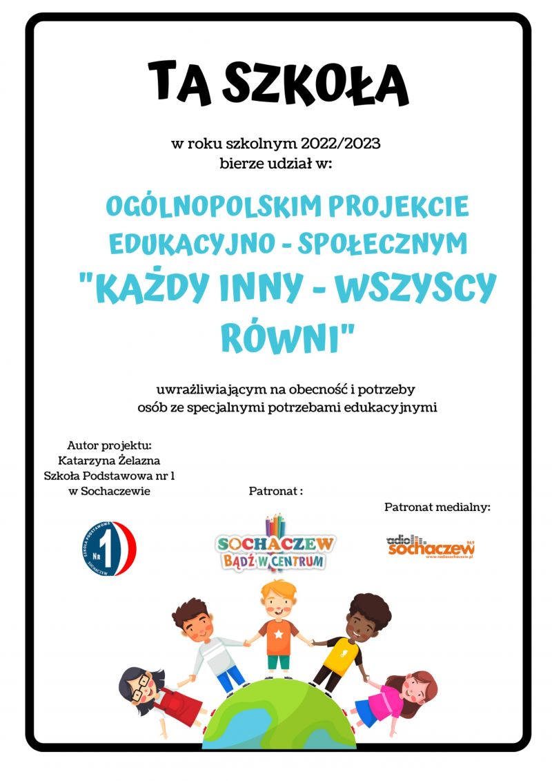 Z przyjemnością informujemy że nasza szkoła bierze udział w rocznym Ogólnopolskim Projekcie Edukacyjno –Społecznym „Każdy inny – wszyscy równi”. Organizatorem jest Szkoła Podstawowa w Sochaczewie, a zgłosiło się do niego ponad 250 placówek z całego kraju, w tym również i nasza.