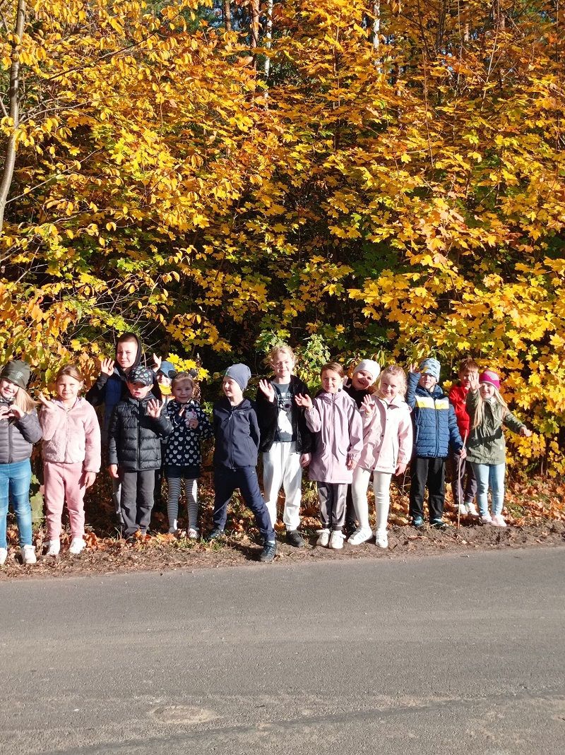 Klasa 1b korzystając z czwartkowej, słonecznej pogody wybrała się na spacer do pobliskiego lasu, w poszukiwaniu Jesieni i jej skarbów. Przed wyjściem panie przypomniały zasady bezpieczeństwa jakie obowiązują podczas wspólnych wyjść i spacerów.