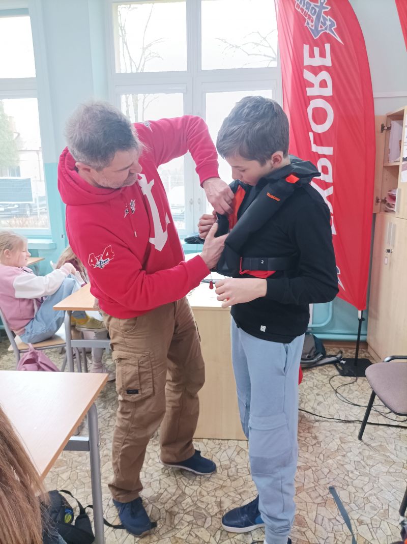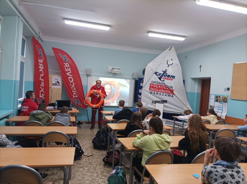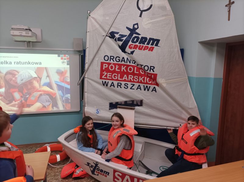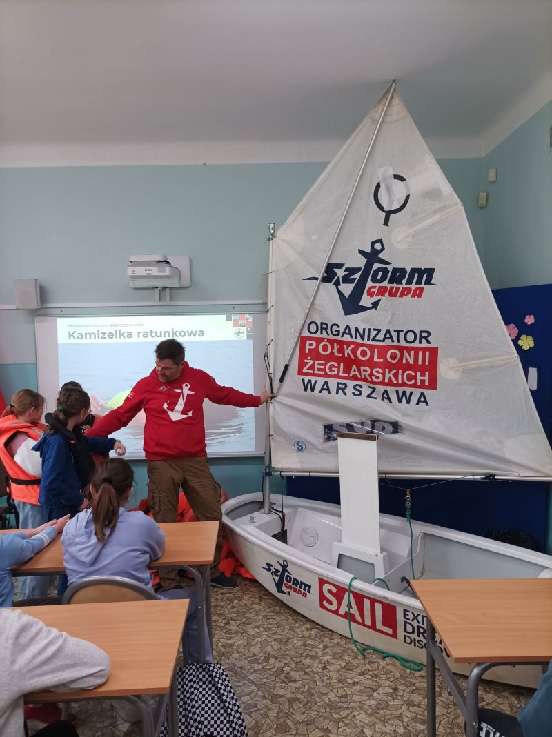 1 i 2 marca uczniowie klas 1-5 mogli uczestniczyć w lekcjach prowadzonych przez animatorów Fundacji Sztorm. Na zajęciach „Bezpieczna woda” uczniowie poznali podstawowe nazwy elementów żaglówki, mogli założyć kapok, koło ratunkowe, wejść do małego jednoosobowego jachtu Optimista. Dzieci dowiedziały się gdzie można się kapać, jak przygotować się na plażę, w jaki sposób wzywać pomocy w razie niebezpieczeństwa nad wodą. Zabawa była przednia, a najważniejsze, że bezpośredni kontakt z jachtem rozbudził ich zainteresowania do nowych wyzwań sportowych.