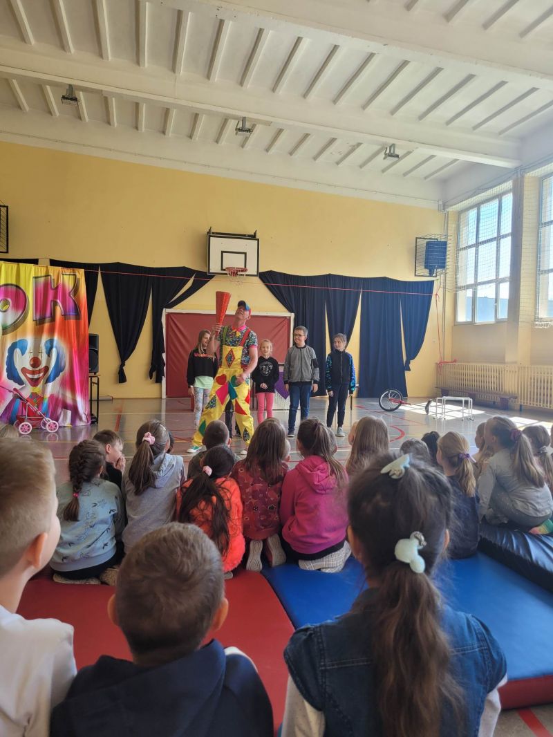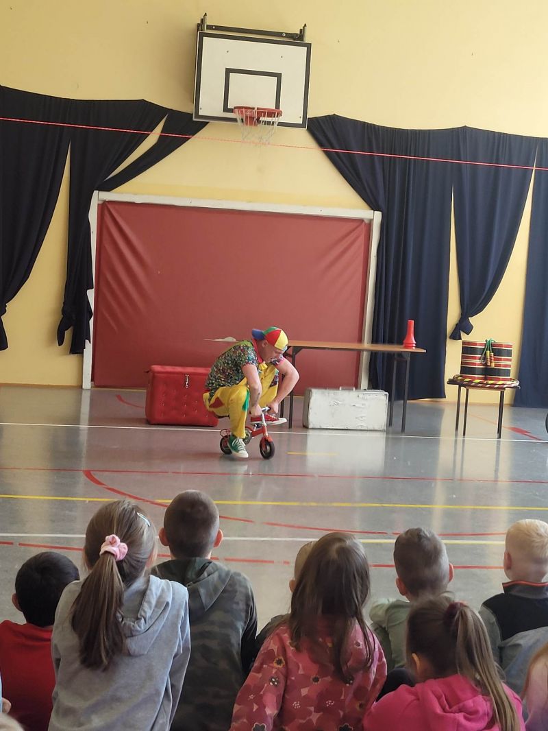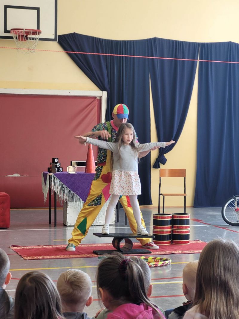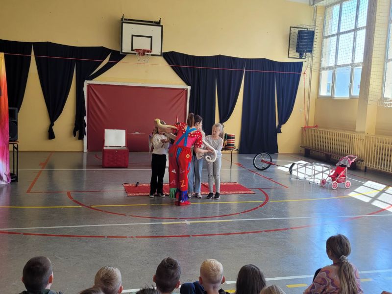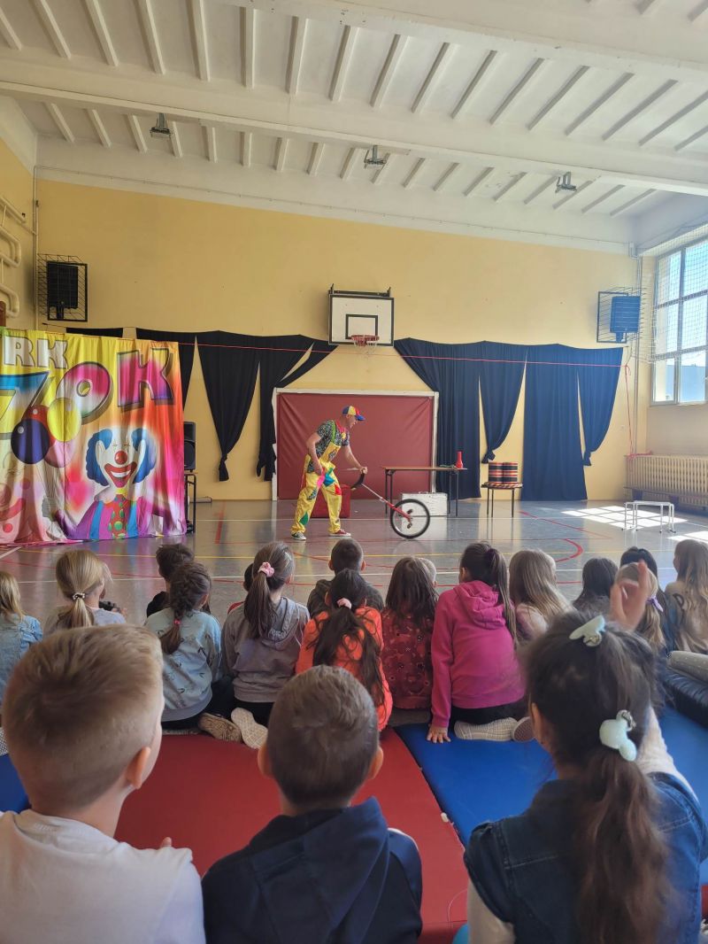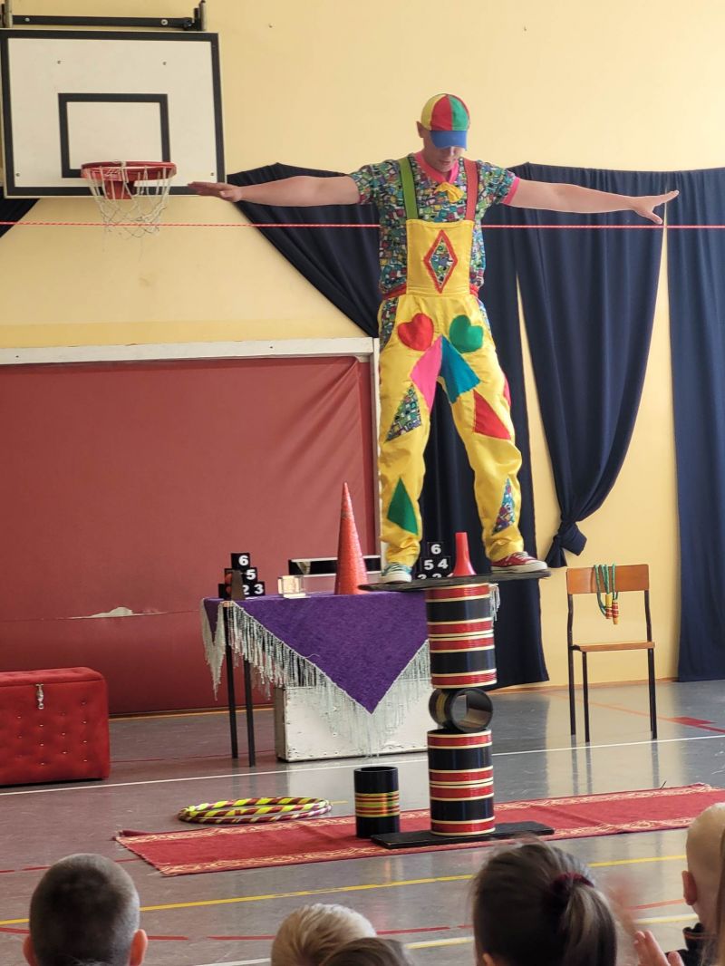 Występ rozpoczął się od trudnego pokazu żonglera- wesołego klowna, który bawił dzieci swoimi sztuczkami. Następnym, ciekawszym punktem przedstawienia był pokaz węza. wykonu. Na scenie pojawiły się też tresowane pieski.
