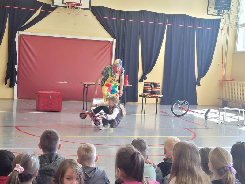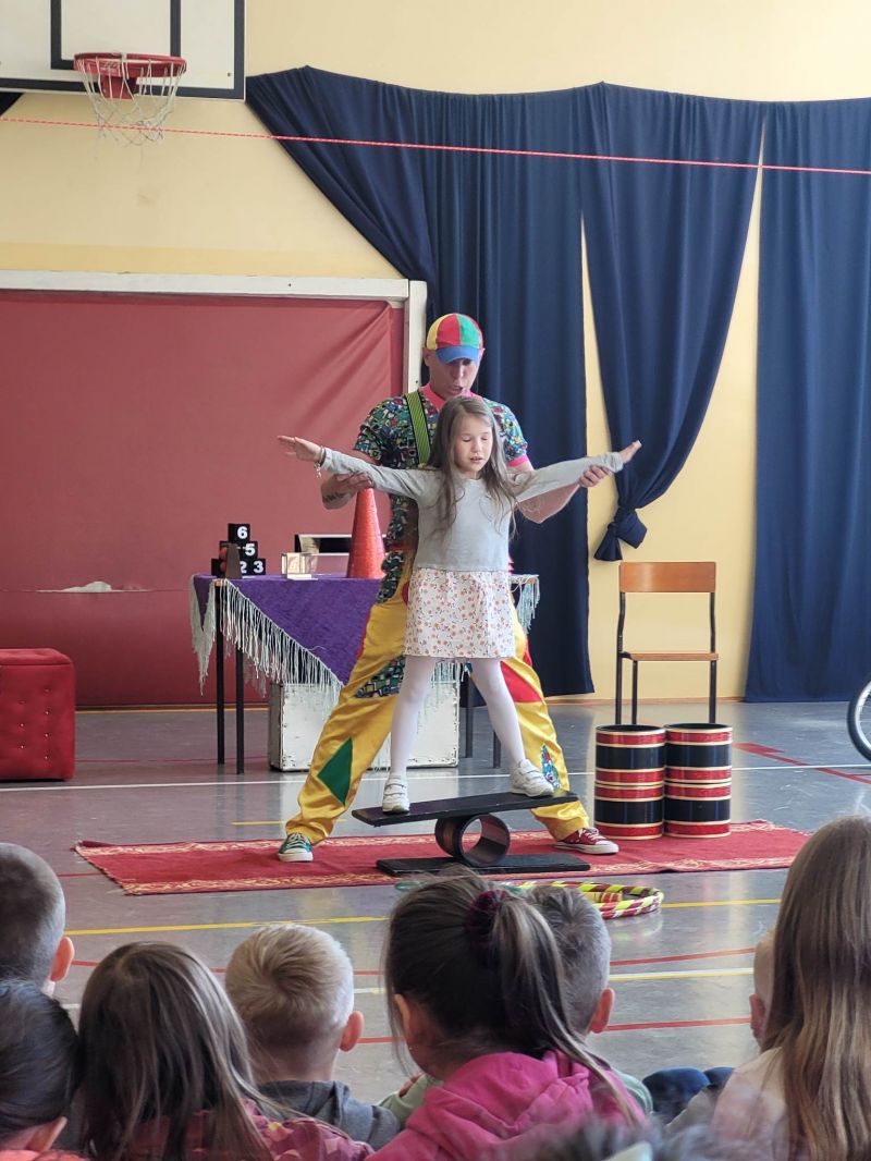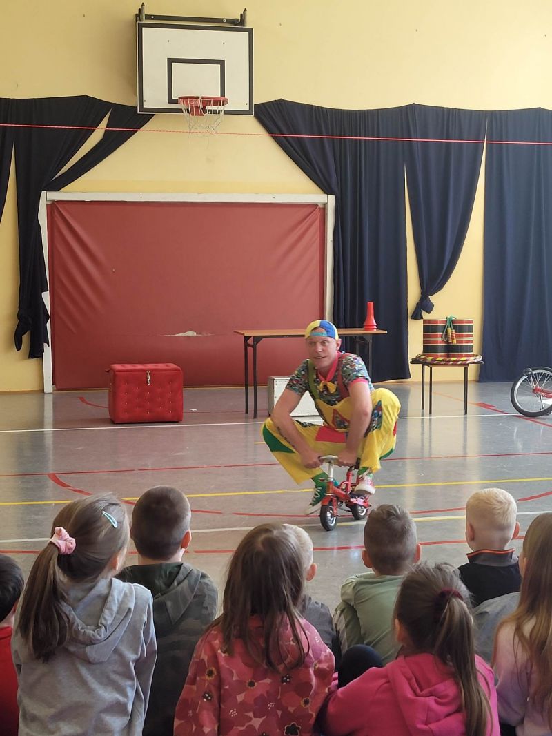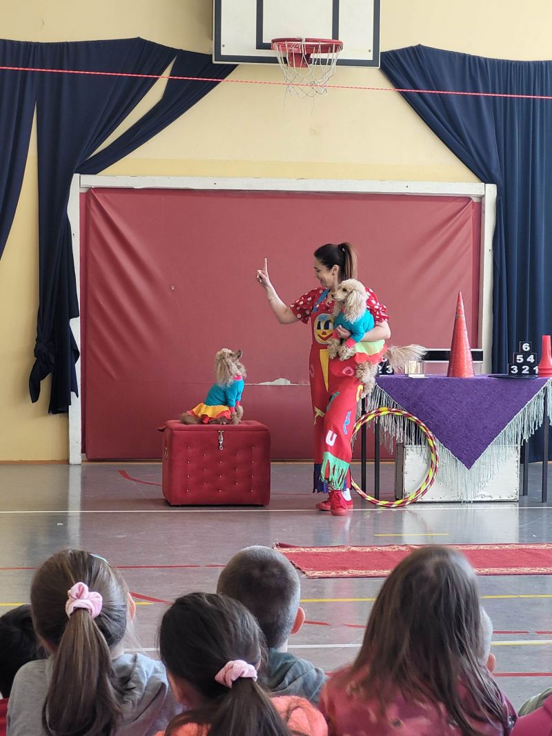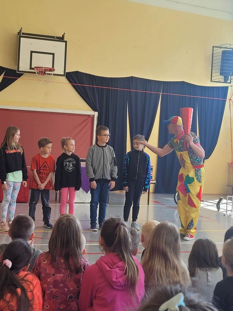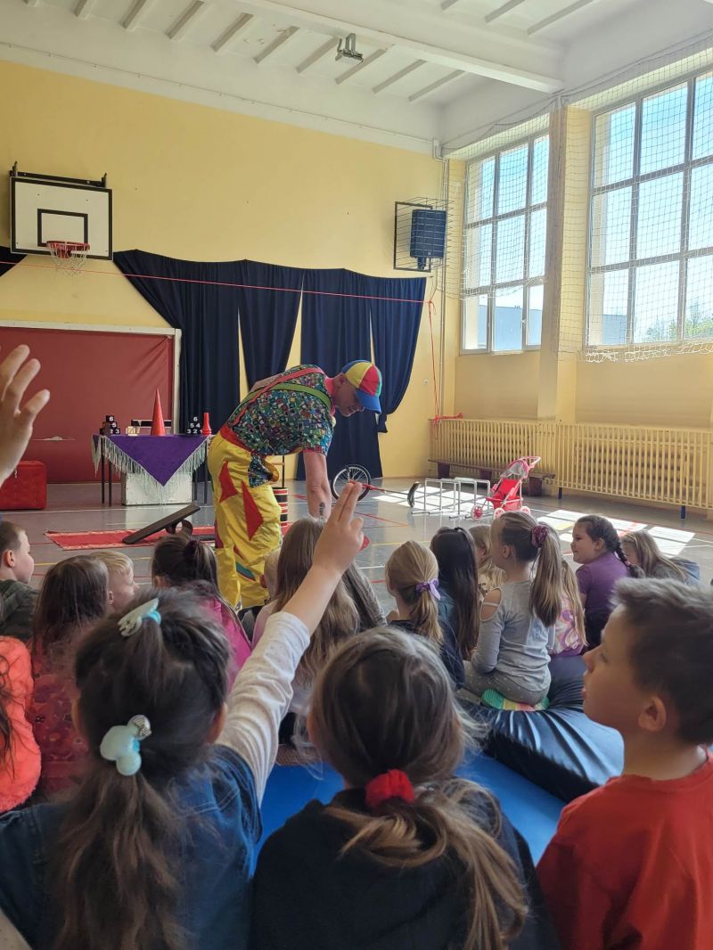 Występ rozpoczął się od trudnego pokazu żonglera- wesołego klowna, który bawił dzieci swoimi sztuczkami. Następnym, ciekawszym punktem przedstawienia był pokaz węza. wykonu. Na scenie pojawiły się też tresowane pieski.