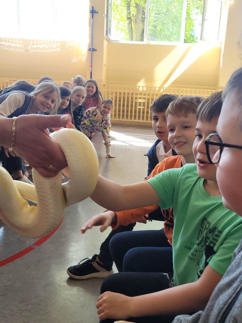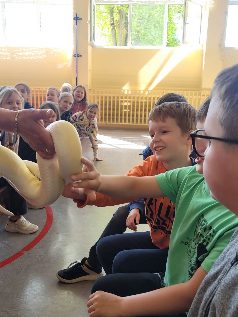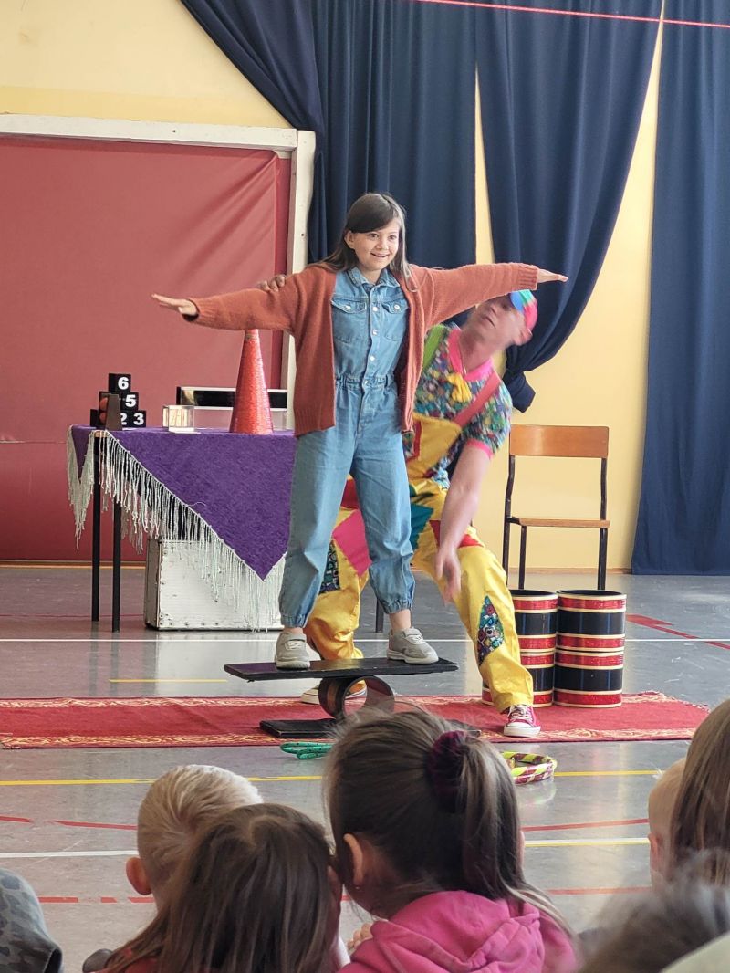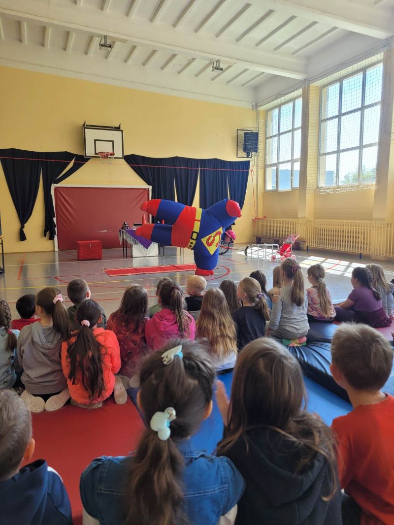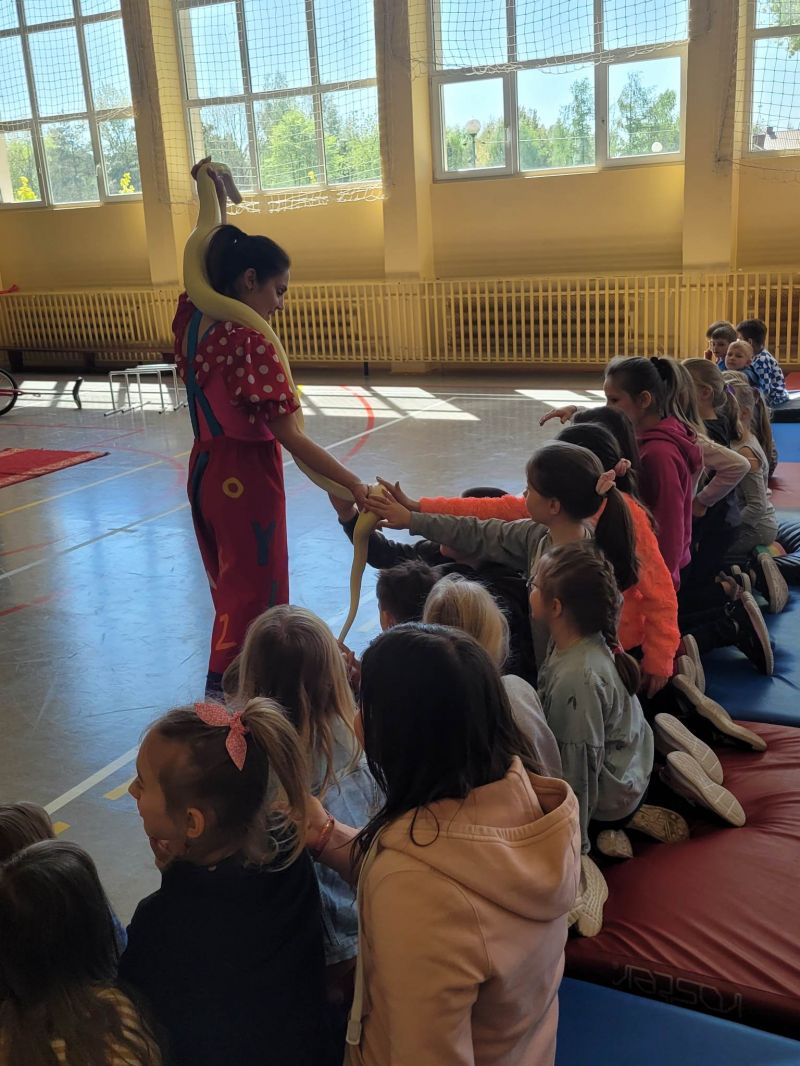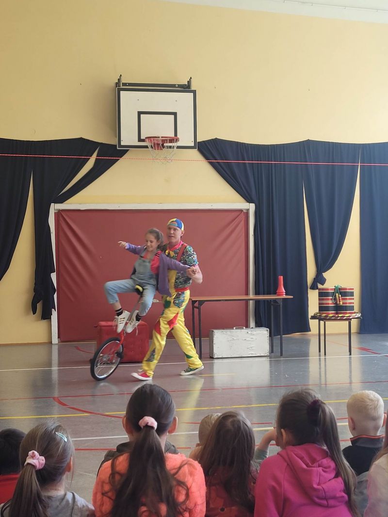 Występ rozpoczął się od trudnego pokazu żonglera- wesołego klowna, który bawił dzieci swoimi sztuczkami. Następnym, ciekawszym punktem przedstawienia był pokaz węza. wykonu. Na scenie pojawiły się też tresowane pieski.