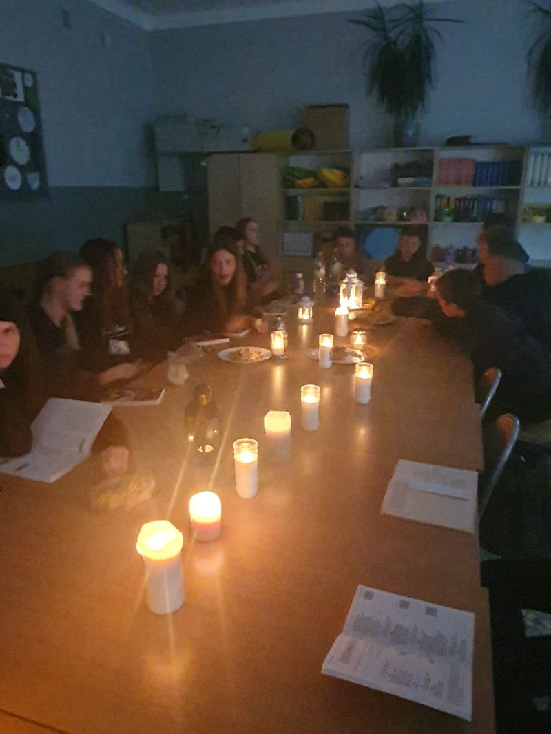 Dziś klasa 7b uczestniczyła w lekcjach języka polskiego, podczas których w ciemności, przy blasku świec przeczytała wspólnie II część dramatu naszego wieszcza.